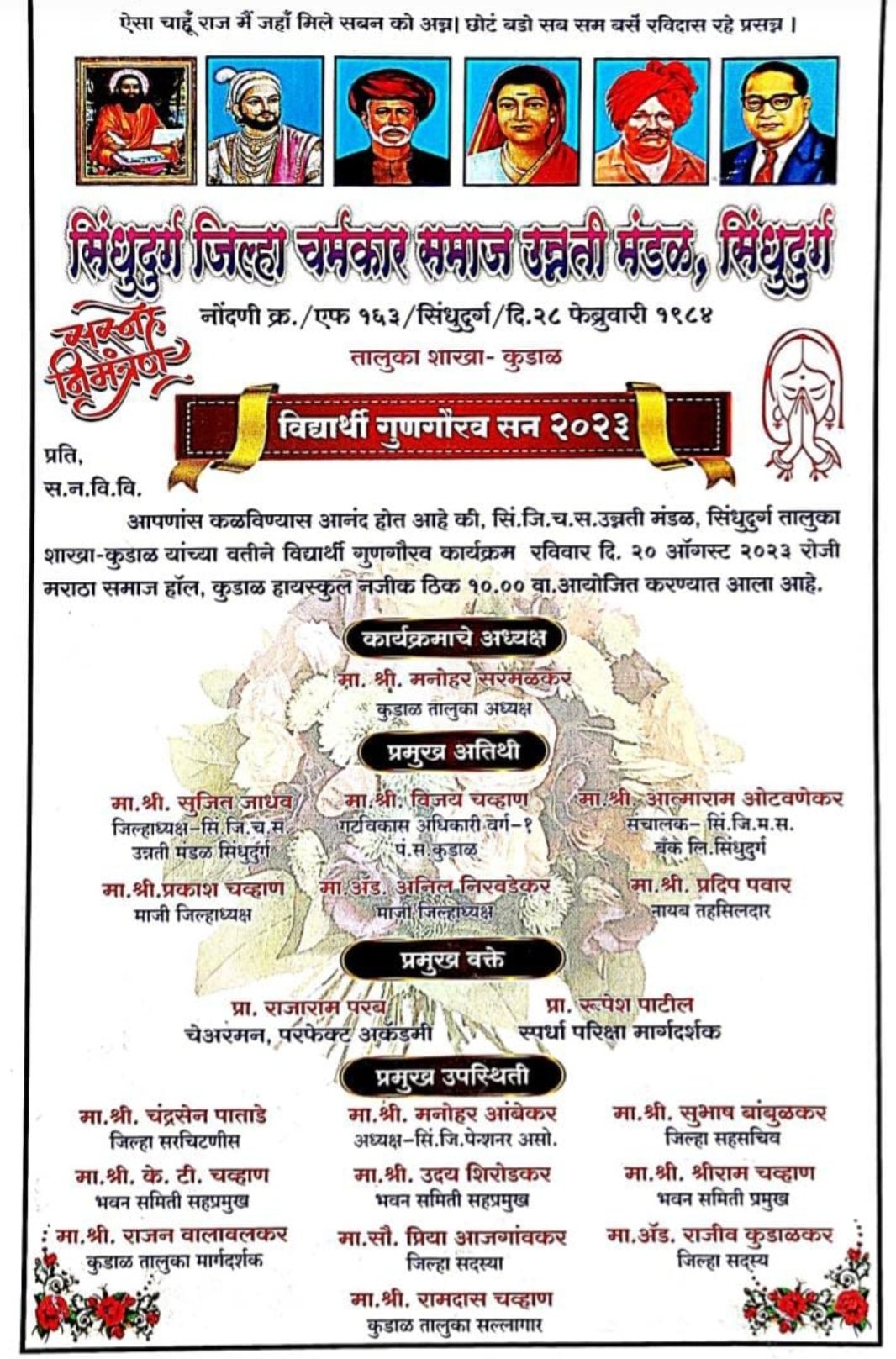 यावेळी कुडाळ तालुक्यातील चर्मकार समाजातील सन 2022 – 23 या शैक्षणिक वर्षात स्कॉलरशिप, नवोदय परीक्षा, इयत्ता दहावी, इयत्ता बारावी, पदवी, पदविका, पदव्युत्तर परीक्षा विशेष उत्तीर्ण असलेल्या विद्यार्थी-विद्यार्थिनी तसेच सेवानिवृत्त झालेले कर्मचारी व अधिकारी वर्ग तसेच विशेष उल्लेखनीय कामगिरी करणाऱ्या समाज बांधवांचा यथोचित सन्मान करण्यात येणार आहे.