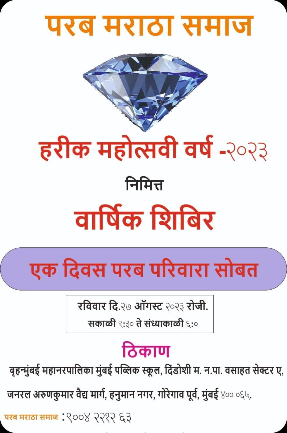 सिंधुदुर्ग प्रतिनिधी: परब मराठा समाज – मुंबईच्या वतीने हरीक महोत्सवी वर्ष -२०२३ निमित्त मुंबई, सिंधुदुर्ग, पुणे, गोवा, बेळगाव, आणंद-गुजरात येथील प्रतिनिधींचे कार्यकर्ता शिबिराचे आयोजन रविवार दि. २७ ऑगस्ट २०२३ रोजी सकाळी ९ ते सायंकाळी ६ वा. र्बृहन्मुंबई महानगरपालिका मुंबई पब्लिक स्कूल, दिंडोशी म.न.पा. वसाहत, सेक्टर – A, हनुमान नगर, जनरल अरुण कुमार वैद्य मार्ग, गोरेगाव (पूर्व), मुंबई – ६५. येथे करण्यात आले आहे.