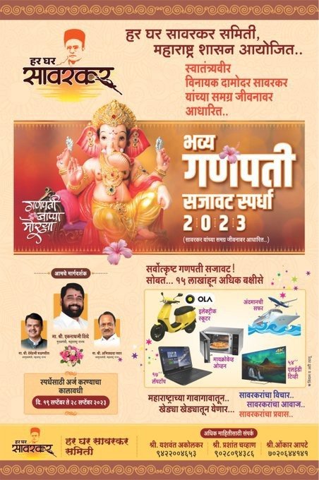 १४ सप्टेंबर वार्ता: मुख्यमंत्री एकनाथ शिंदे, उपमुख्यमंत्री देवेंद्र फडणवीस आणि अजित पवार यांच्या मार्गदर्शनाखाली कार्यरत असलेल्या अन् महाराष्ट्र शासन यांचे सहकार्य लाभलेल्या ‘हर घर सावरकर समिती’च्या वतीने अखिल महाराष्ट्र ‘गणपति आरास स्पर्धा २०२३’चे आयोजन करण्यात आले आहे. १९ ते २८ सप्टेंबर या कालावधीत ही स्पर्धा असून या स्पर्धेत स्वातंत्र्यवीर विनायक दामोदर सावरकर यांच्या समग्र जीवनावर आधारित आरास, देखावे सादर करायचे आहेत. या स्पर्धेत कौटुंबिक, सोसायटी, मित्रमंडळ, शाळा, तसेच सार्वजनिक मित्रमंडळ अशा विविध स्तरांवर महाराष्ट्रातील ३६ जिल्ह्यांमध्ये स्पर्धक भाग घेऊ शकतात.विविध विभागांतील विजेत्या स्पर्धकांना १५ लाखांपेक्षा अधिक रकमेची बक्षिसे देण्यात येणार आहेत, ज्यामध्ये अंदमानची सहल, इलेक्ट्र्रिक स्कूटर, टिलर ट्रॅक्टर, ५४ एल्ईडी टीव्ही, शीतकपाट, सोलर वॉटर पंप यांसारख्या विविध बक्षिसांचा समावेश आहे. ‘हर घर सावरकर समिती, महाराष्ट्र शासन’ यांच्या वतीने स्वातंत्र्यवीर सावरकर यांचे विचार आणि कार्य घराघरांत पोचवण्यासाठी ‘हर घर सावरकर’ अभियानाचे आयोजन करण्यात आले आहे. २१ मे २०२३ या दिवशी रायगड येथून छत्रपती शिवाजी महाराज यांना मानवंदना देऊन या अभियानाचा प्रारंभ करण्यात आला आणि त्यानंतर विविध शहरांत विविध उपक्रम राबवण्यात आले.
