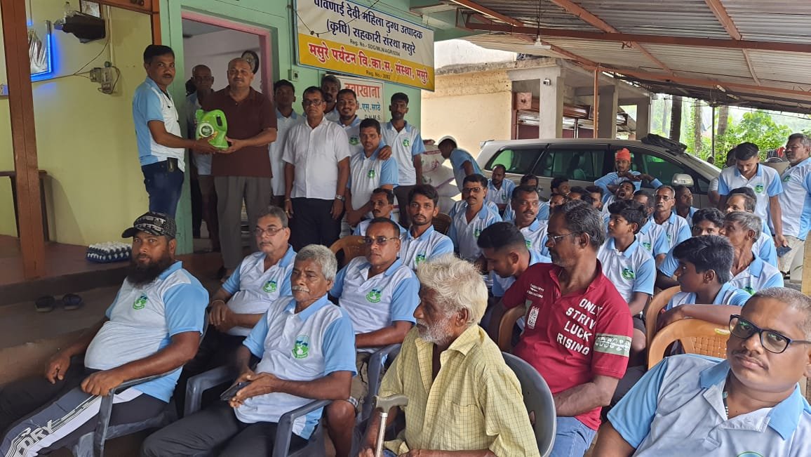 यावेळी बोलताना डॉक्टर विश्वास साठे म्हणालेत पावनाही देवी महिला दूध उत्पादन संस्थेच्या माध्यमातून वेळोवेळी दूध उत्पादित शेतकऱ्यांसाठी अनोखे उपक्रम आणि सर्व प्रकारची मदत दिली जाते. या सर्व शेतकऱ्यांचे दूध उत्पादन वाढावे आणि त्यातून त्यांना आर्थिक सुबत्ता यावी यासाठी ही संस्था या सर्व शेतकऱ्यांच्या मागे खंबीरपणे उभी आहे. भविष्यामध्ये या परिसरामध्ये दुधाच्या माध्यमातून येथील शेतकऱ्यांना सुजलाम सुफलाम बनवण्याचा मानस व्यक्त केला. यानंतर येथील शेतकऱ्यांना दूध उत्पादन वाढीसाठी कोणत्या गोष्टीची खबरदारी घेणे जरुरी आहे आणि आपल्या सर्व जनावरांची काळजी कशा पद्धतीने घ्यावी तसेच बायोगॅस निर्मितीसाठी शासनाकडून कोणत्या संधी उपलब्ध आहेत याविषयी उपस्थित शेतकऱ्यांना महत्त्वपूर्ण मार्गदर्शन प्रसाद देवधर यांनी केले. उपस्थित सर्व दूध उत्पादित शेतकऱ्यांनी डॉक्टर प्रसाद देवधर यांना विविध प्रश्न विचारून शंका निरसन केलि. यावेळी संस्थेच्या अध्यक्षा डॉक्टर अलका साठे, पांडुरंग ठाकूर, रमेश पाताडे, सचिन गोलतकर, सतीश बांदिवडेकर, आबा घाडीगावकर, अभी दुखंडे, तुळशीदास चव्हाण, मोहम्मद खान, उमेश बागवे, शामा सावंत, आबा मसुरकर, धोंडी शिंदे, कृष्णा गिरकर, मुबारक मीर, स्वप्निल ठाकूर, विकास ठाकूर, भारती सावंत, दशरथ नार्वेकर, आबा अहिर, निलेश लोके, संतोष घाडीगावकर, हेमंत बागवे आदी बहुसंख्य दूध उत्पादक शेतकरी आणि संस्थेचे सभासद उपस्थित होते. सर्व मान्यवरांचे स्वागत डॉक्टर साठे यांनी केले. उपस्थित सर्व दूध उत्पादित शेतकऱ्यांनी डॉक्टर विश्वास साठे आणि पावनाई देवी महिला दूध उत्पादक संस्थेच्या मोफत तेल आणि टी शर्ट वाटप या अनोख्या उपक्रमाबद्दल त्यांचे आभार व्यक्त केले…