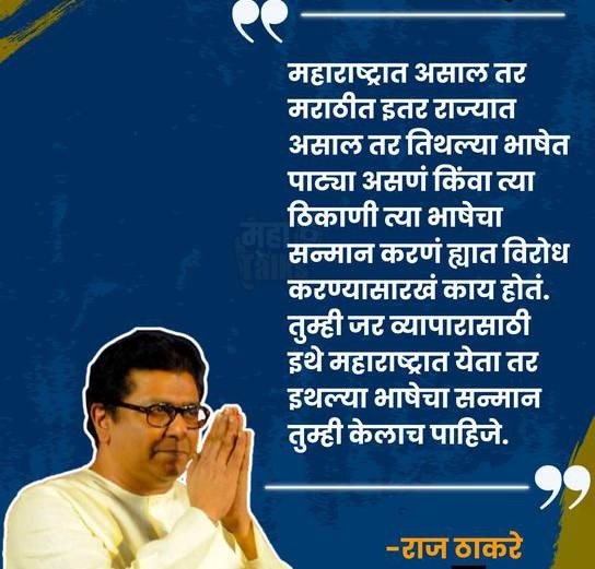 मराठी पाटीवर महाराष्ट्र सैनिकांचेही लक्ष असेल, हे विसरू नका! – राज ठाकरे, अध्यक्ष, मनसे दुकानदारांनीही नसत्या भानगडीत पडू नये. न्यायालयाच्या निर्णयाचा आदर करावा. दुकानांच्या नावांची पाटी मराठी भाषेत असावी, यासाठी राज्यशासन लक्ष ठेवेल आणि कारवाई करील; पण याकडे माझ्या महाराष्ट्र सैनिकांचेही लक्ष असेल, हे विसरू नका, असे ‘ट्वीट’ मनसेचे अध्यक्ष राज ठाकरे यांनी केले आहे. राज्यातील सर्व दुकानांना मराठीत पाटी लावण्याचा आदेश सर्वोच्च न्यायालयाने दिला आहे. त्यावर राज ठाकरे यांनी वरील प्रतिक्रिया व्यक्त केली. सर्वोच्च न्यायालयाच्या या निर्णयाविषयी राज ठाकरे यांनी अभिनंदनही केले आहे.