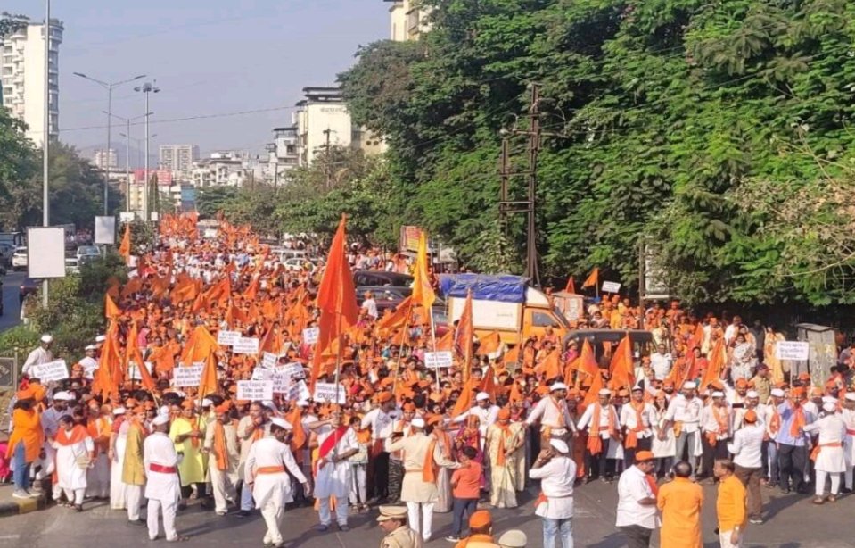 नवी मुंबई : लव्ह जिहाद आणि धर्मांतर विरोधातील कायदा राज्यासह संपूर्ण देशात लागू करावा या मागणीसाठी नवी मुंबईत सकल हिंदू समाजाच्या वतीने भव्य हिंदू जन आक्रोश मोर्चा काढण्यात आला होता. नवी मुंबईतील कोपरी नाका सेक्टर २८ येथील ब्लू डायमंड हॉटेल चौकातून या मोर्चाला सुरुवात झाली होती. भगवे झेंडे, भगव्या पताका हातात घेऊन हजारो नागरिक सहभागी झाले होते. सर्वांनी भगव्या टोप्या परिधान केल्या होत्या. नवी मुंबईत भगवे वादळ अवतरले होते. युवा, महिला, विद्यार्थी, जेष्ठ, विविध हिंदू पंथ आणि संप्रदायाचे, हिंदू संघटनांचे प्रतिनिधी या मोर्चात सहभागी झाले होते. महिला भगिनींनी या मोर्चाचे नेतृत्व केले. लव्ह जिहाद आणि धर्मांतरविरोधी कायदा राज्यासह देशभरात लागू करावा, श्रद्धा वालकर प्रकरणी आरोपी आफताबला जन्मठेपेची शिक्षा मिळावी, लव्ह जिहाद विरोधी कायद्याची अंमलबजावणी करण्यात यावी, या मागणीसाठी सकल हिंदू समाजाकडून हिंदू जन आक्रोश मोर्चा काढण्यात आला. यावेळी जिहादविरोधी कायदा झालाच पाहिजे, वंदे मातरम, जय श्रीराम.. जय श्रीराम शिवाजी महाराज की जय, अशा घोषणा देण्यात आली. या मोर्चात कोणताही अनुचित प्रकार घडू नये, यासाठी पोलिसांचा मोठा बंदोबस्त करण्यात आला होता. या मोर्चात भाजपाचे नेते सहभागी झाले होते. लोकनेते आमदार गणेश नाईक, माजी खासदार डॉक्टर संजीव नाईक, ऐरोली विधानसभा मतदारसंघाचे प्रथम आमदार संदीप नाईक, माजी महापौर सागर नाईक, भाजपाचे नवी मुंबई जिल्हाध्यक्ष रामचंद्र घरत, माथाडी कामगारांचे नेते नरेंद्र पाटील, यासह विविध पक्षीय माजी नगरसेवक उपस्थित होते. मुलींना फसवून त्यांच्याशी लग्न केले जात आहे, यानंतर धर्मांतरासाठी त्यांच्यावर दबाव टाकला जातो. लव जिहाद विरोधात आजचा हा जनजागरण मोर्चा असून लव्ह जिहादच्या माध्यमातून मुलींवर धर्मांतरासाठी अत्याचार केले जातात, त्यामुळे केंद्र आणि राज्य सरकारने धर्मांतर बंदी कायदा लवकरात लवकर करावा. युवा पिढीमध्ये कारस्थान रचून अमली पदार्थांचा प्रचार केला जातो आहे. बांगलादेशी घुसखोरांमुळे देशाच्या सुरक्षेला धोका निर्माण झालेला आहे. भारतीयांच्या हक्कावर डल्ला मारणाऱ्या या घुसखोरांना देशाबाहेर हाकलून दिलं पाहिजे. आज हिंदू समाज संयमी आहे, मात्र त्याच्या संयमाचा अंत पाहू नका, लवकरात लवकर लव जिहाद विरोधातील कायदा करा, अशी हाक या मोर्चात देण्यात आली. या मोर्चाची सांगता वाशी येथील छत्रपती शिवाजी महाराज चौकात झाली.
