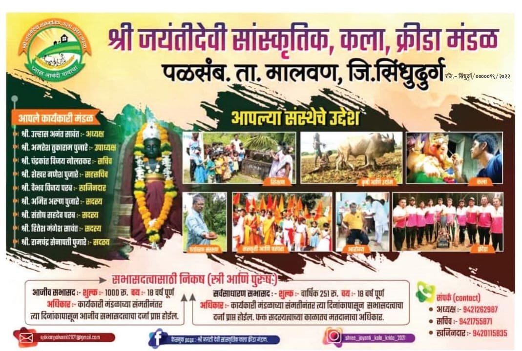 पळसंब येथील जयंती देवी सांस्कृतिक कला क्रीडा मंडळातर्फे आई जयंती देवी- रवळनाथ पंचायतन देवस्थानच्या नवरात्रोत्सवानिमित्त कार्यक्रमांचे आयोजन केले आहे. यामध्ये दि. १७ ऑक्टोबर रोजी संगीत खुर्ची स्पर्धा, १८ रोजी बकेटमध्ये चेंडू फेकणे स्पर्धा, १९ रोजी मुलींसाठी रांगोळी स्पर्धा, २० रोजी लहान मुलांसाठी फॅन्सी ड्रेस स्पर्धा, २२ रोजी महिलांसाठी हात बांधून चेंडू गोळा करणे स्पर्धा, २३ रोजी महिलांसाठी खेळ व स्पर्धा, मुला, मुलींसाठी तळ्यात मळ्यात स्पर्धा घेण्यात येणार आहेत. या सर्व स्पर्धा गाव मर्यादित आहेत. स्पर्धकांनी अक्षय परब (९४०५७९६१३३) व अमित पुजारे यांच्याकडे नाव नोंदणी करावी असे आवाहन करण्यात आले आहे.