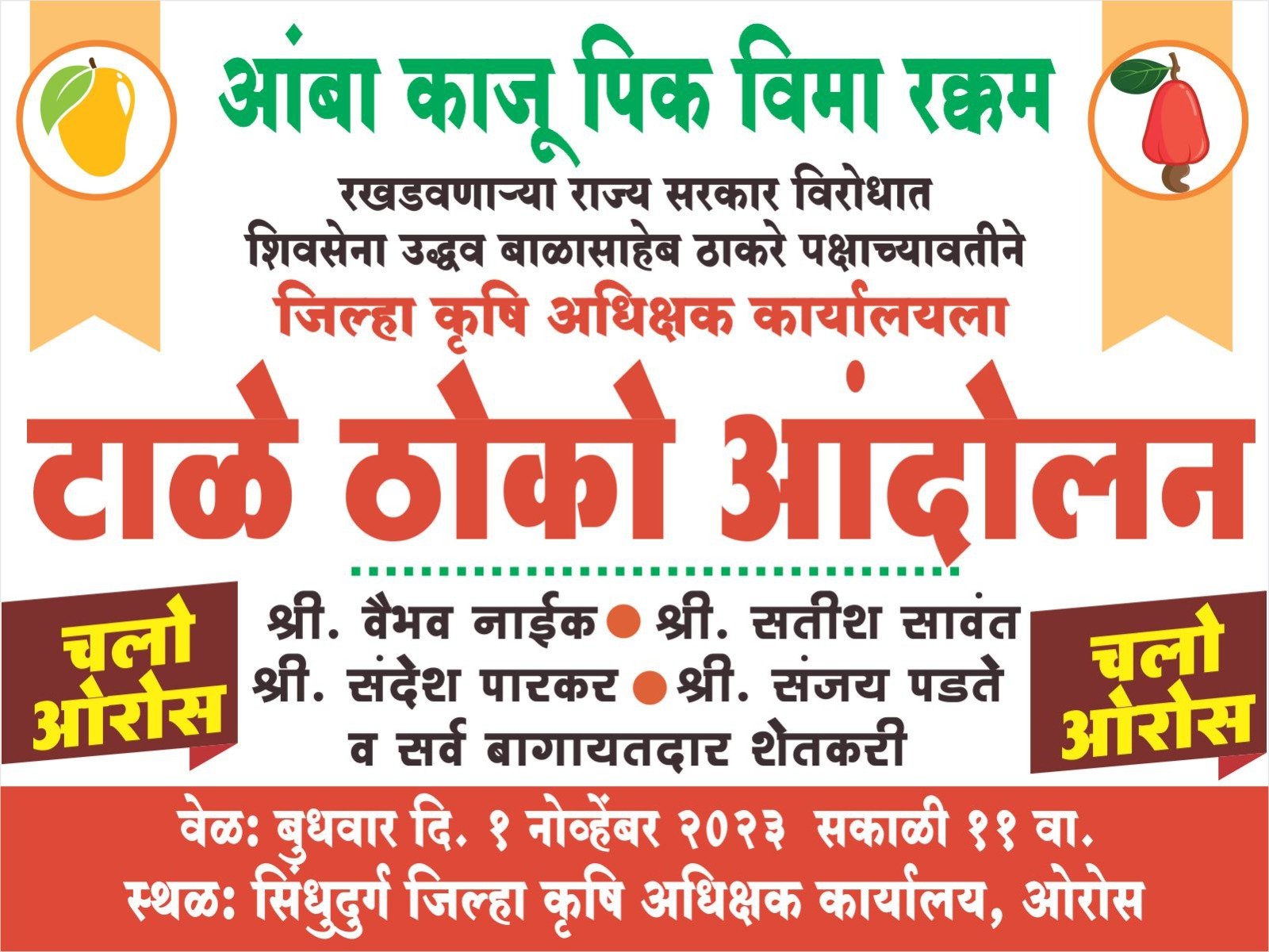 सिंधुदुर्ग: आंबा व काजू पिक विमा योजनेत राज्य व केंद्र शासनाने आपल्या हिस्स्याचा विम्याचा ५३ कोटी रु. हप्ता विमा कंपनीकडे वर्ग न केल्याने शेतकरी पिक विमा नुकसान भरपाई पासून वंचीत आहेत. त्यामुळे शेतकऱ्यांच्या नुकसानीची सुमारे १२० कोटी रु रक्कम प्रलंबीत आहे.ही रक्कम गणपती पूर्वी मिळावी यासाठी शिवसेना उद्धव बाळासाहेब ठाकरे पक्षाने आंदोलन केले होते.त्याचबरोबर सिंधुदुर्गातील शेतकऱ्यांनी देखील रस्त्यावर उतरून आंदोलन केले होते.राज्याच्या कृषी मंत्र्यांचे लक्ष वेधल्यानंतर गणपती पूर्वी विमा रक्कम देण्याची ग्वाही त्यांनी दिली होती.मात्र आता फळ पिकांचा नवीन हंगाम सुरू व्हायला आला तरी देखील विमा रक्कम शेतकऱ्यांना मिळालेली नाही. औषध फवारणीसाठी, झाडांची देखभाल करण्यासाठी लागणारे पैसे आता शेतकऱ्यांकडे नाहीत. आंदोलने करून निवेदने देऊन देखील सरकार याकडे लक्ष देत नसल्याने १ नोव्हेंबर २०२३ रोजी पुन्हा शिवसेना उद्धव बाळासाहेब ठाकरे पक्षाच्या वतीने तीव्र आंदोलन छेडून सिंधुदुर्ग जिल्हा कृषी अधिक्षक कार्यालयाला टाळे ठोकण्याचा इशारा आमदार वैभव नाईक, जिल्हा बँक माजी अध्यक्ष सतीश सावंत यांनी दिला आहे.