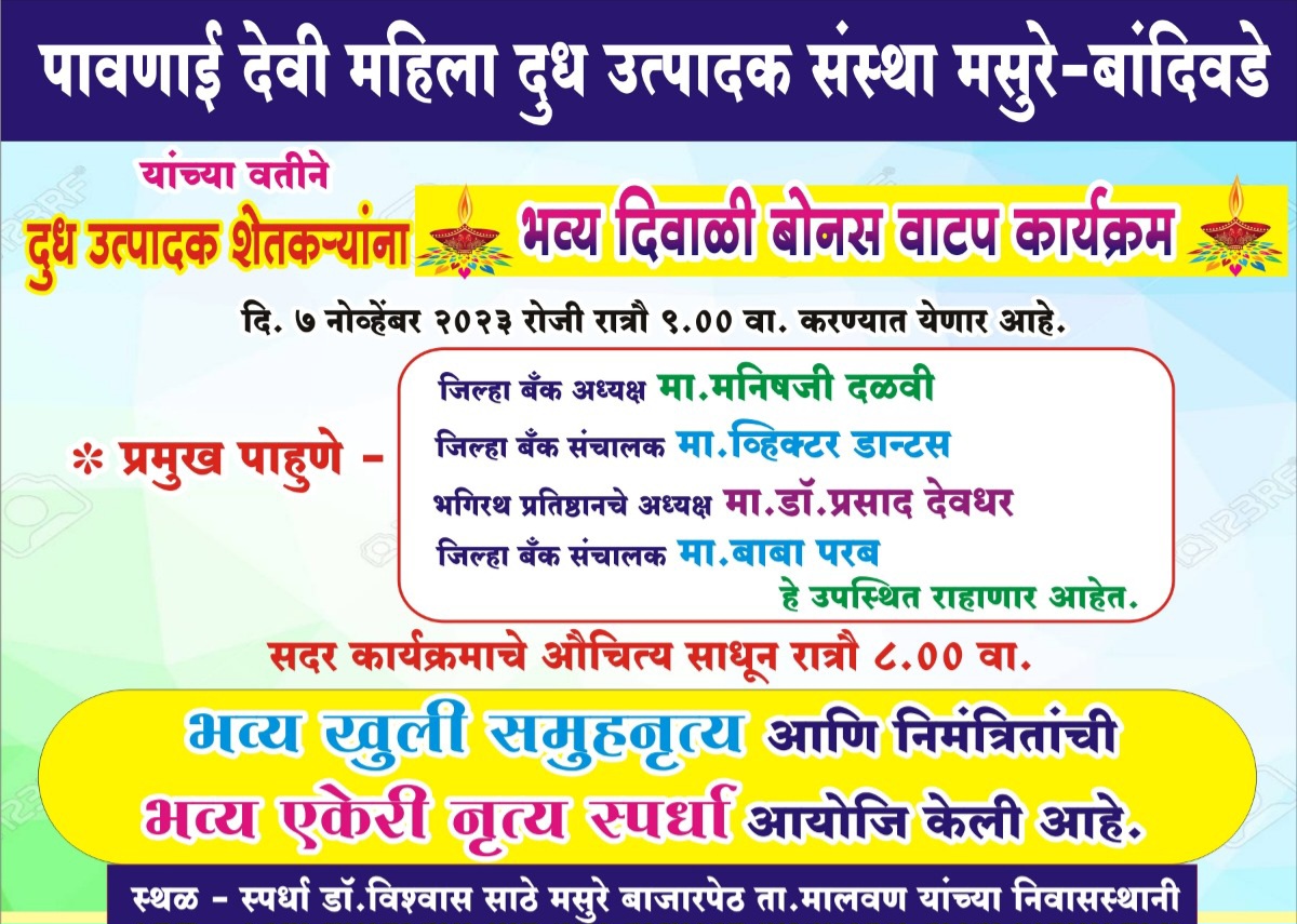 पावणाई देवी महिला दुग्धोत्पादक संस्था मसुरे- बांदिवडे यांच्यावतीने दूध उत्पादक शेतकऱ्यांना भव्य दिवाळी बोनस वाटप कार्यक्रम दिनांक ७ नोव्हेंबर २०२३ रोजी रात्री ९.०० वा. करण्यात येणार आहे. यावेळी प्रमुख पाहुणे म्हणून जिल्हा बँक अध्यक्ष माननीय मनीष दळवी, भगीरथ प्रतिष्ठान चे अध्यक्ष माननीय डॉ. प्रसाद देवधर, जिल्हा बँक संचालक माननीय व्हीक्टर डान्टस हे उपस्थित राहणार आहेत.