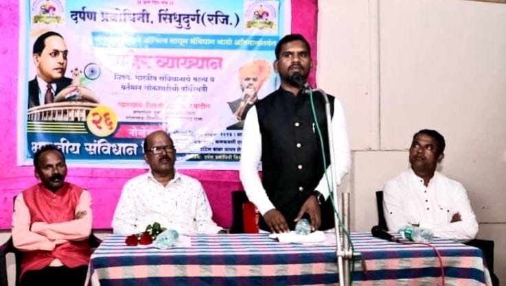 भारतीय संविधान दिना निमित्त दर्पण प्रबोधिनी सिंधुदुर्ग या संस्थेतर्फे येथील उत्कर्षा हॉल येथे भारतीय संविधानाचे महत्व व वर्तमान लोकशाहीची परिस्थिती’ या विषयावर व्याख्यान देताना श्री. पाटील बोलत होते. यावेळी दर्पण प्रबोधिनी संस्थेचे अध्यक्ष आनंद तांबे व पदाधिकारी उपस्थित होते.