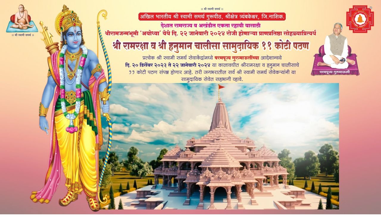 श्री क्षेत्र त्रंबकेश्वर येथील गुरुपिठामध्ये शनिवारी राज्याभरातून आलेल्या सेवेकरांना परमपूज्य गुरु माऊलींनी संबोधित केले. ते म्हणाले की, अयोध्या येते दिनांक २२ जानेवारी २०२४ रोजी श्रीराम मंदिराचा प्राणप्रतिष्ठा सोहळा होत आहे.या निमित्ताने सेवा मार्ग तर्फे अकरा कोटी हनुमान चालीसा आणि अकरा कोटी रामरक्षा स्तोत्राचे सामुदायिक पठण केले जाणार आहे. जगभरातील सेवेकरांनी या सामुदायिक पठण कार्यक्रमात सहभागी व्हावे असे आवाहन त्यांनी केले.जगभर राम राज्य यावे आणि जगातील दैन्य दुःख दारिद्र्य दूर होऊन जनता सुखी व्हावी व होऊ घातलेल्या कार्यक्रम सुरळीत संपन्न व्हावा या उद्देशाने सामुदायिक पटनाचा कार्यक्रम आयोजित करण्यात आला आहे असे त्यांनी स्पष्ट केले.