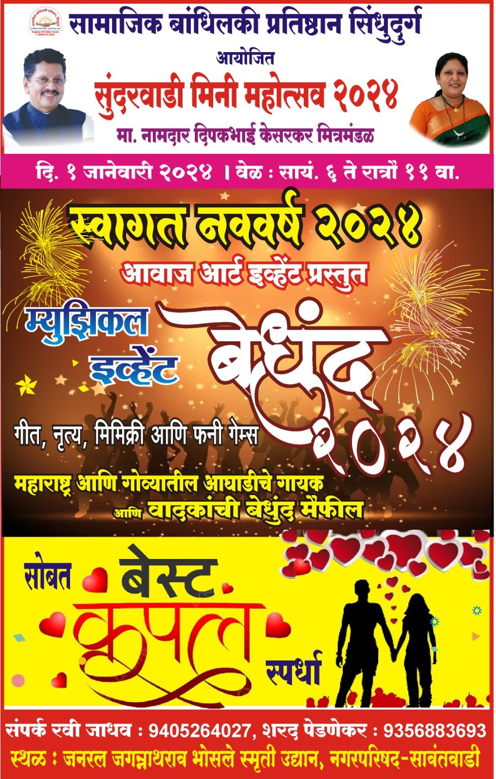 सावंतवाडी प्रतिनिधी: सांस्कृतिक पर्यटन महोत्सवास आपण भरभरून प्रतिसाद देत आहात.. दिनांक २७ ते ३१ डिसेंबर या कालावधीत सुरू असलेला हा महोत्सव त्यातील विविध वस्तू आणि खाद्यपदार्थ स्टॉल्स यांवर असलेली प्रचंड गर्दी पाहता आपला नागरिकांचा उत्साह द्विगुणित करण्यासाठी आम्ही सामाजिक बांधिलकी प्रतिष्ठान सिंधुदुर्ग च्या वतीने हा पर्यटन मिनी महोत्सव १ जानेवारी २०२४ पर्यंत वाढविण्याचा निर्णय घेतला आहे. दिनांक १ जानेवारी २०२४ रोजी सावंवाडीतील या सांस्कृतिक मिनी महोत्सवात आपण नवीन वर्ष जल्लोष कार्यक्रम सामाजिक बांधिलकी प्रतिष्ठान सिंधुदुर्ग ने आयोजित केले आहे. बेधुंद २०२४ ( गीत, नृत्य, मिमिक्री असा महाराष्ट्रा व गोव्यातील नावजेल्या गायक वादक आणि डान्सर)असा जल्लोष कार्यक्रम करणार आहोत..सोबतच आपण सावंतवाडी तालुका मर्यादित फक्त दहा स्पर्धकांसाठी बेस्ट कपल २०२४ (नवरा बायको) ही स्पर्धा घेणार आहोत..तरी आपणा सर्व सावंतवाडीकर, रसिक, पर्यटक यांनी या १ जानेवारी रोजी या मिनी महोस्तव ठिकाणी भेट देऊन नवीन वर्ष जल्लोष कार्यक्रम मध्ये सहभागी व्हावं ही विनंती. विजेत्या बेस्ट कपल २०२४ साठी आकर्षक ट्रॉफी आणि गिफ्ट voucher देण्यात येतील. बेस्ट कपल २०२४ स्पर्धेत नाव नोंदणीसाठी रवी जाधव व शरद पेडणेकर यांच्याशी आजच संपर्क करा. नियम व अटी लागू.