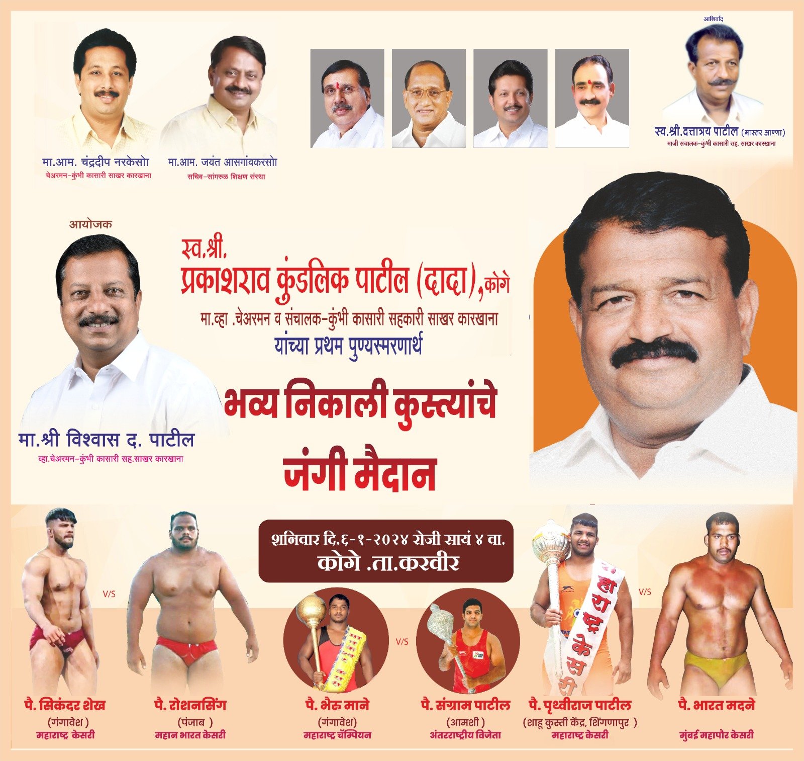 कोल्हापूर प्रतिनिधी: जिल्ह्यातील कुस्तीचे माहेरघर असलेलं कोगे तालुका, करवीर गावात स्व.श्री. कै. प्रकाशराव कुंडलिक पाटील (दादा), मा. व्हा. चेअरमन व संचालक – कुंभी सहकारी साखर कारखाना यांचा प्रथम पुण्यस्मरणार्थ भव्य निकाली कुस्त्यांचे जंगी मैदान शनिवार दि. ६ जानेवारी २०२४ रोजी सायंकाळी ४ वाजता कोगे, तालुका करवीर जिल्हा कोल्हापूर येथे मा.श्री .विश्वास पाटील यांनी आयोजित केले आहे .