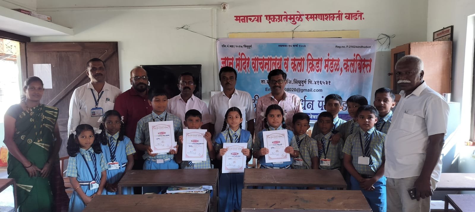 सावंतवाडी प्रतिनिधी: मराठी भाषा पंधरावडा संवर्धन दिनानिमित्त कलंबिस्त प्राथमिक शाळा नंबर १ मध्ये कलंबिस्त ज्ञानमंदिर वाचनालय व कला क्रीडा मंडळ तर्फे घेण्यात आलेल्या हस्ताक्षर सुधार स्पर्धेत विजेत्यांना पारितोषिक देण्यात आले. यावेळी मराठी भाषा पंधरावडा संवर्धन दिन साजरा करण्यात आला. यावेळी प्रमुख पाहुणे म्हणून सामाजिक कार्यकर्ते व कलंबिस्त हायस्कूलचे आजी-माजी विद्यार्थी संघटनेचे अध्यक्ष बाळा राजगे, सामाजिक कार्यकर्ते सखाराम उर्फ बाबू सावंत, ज्ञानमंदिर वाचनाचे माजी सचिव जिल्हा ग्रंथालयाचे संचालक अध्यक्ष एडवोकेट संतोष सावंत, माजी अध्यक्ष रूपा सावंत, उपाध्यक्ष रमेश सावंत, मुख्याध्यापक संजय शेडगे, शिक्षक श्री पावसकर, ग्रंथपाल श्रीमती जाधव आदी उपस्थित होते.