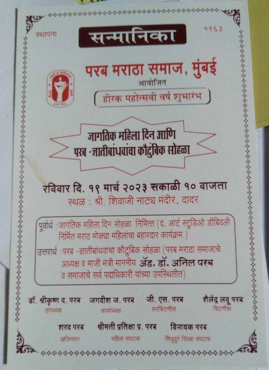 मसुरे प्रतिनिधी: परब मराठा समाज, मुंबई यांच्या वतीने हीरक महोत्सवी वर्ष शुभारंभ निमित्त जागतिक महिला दिन आणि परब – ज्ञातीबांधवांचा कौटुंबिक सोहळा १९ मार्च २०२३ सकाळी १० वाजता श्री. शिवाजी नाट्य मंदीर, दादर मुंबई येथे आयोजित करण्यात आला आहे. जागतिक महिला दिन सोहळा निमित्त द. आर्ट स्टुडिओ डोंबिवली निर्मित मराठ मोळ्या महिलांचा बहारदार कार्यक्रम, परब ज्ञातीबांधवांचा कौटुंबिक सोहळा परब मराठा समाजाचे अध्यक्ष व माजी मंत्री अॅड. अनिल परब व समाजाचे सर्व पदाधिकारी यांच्या उपस्थितीत संपन्न होणार आहे. उपस्थीतीचे आवाहन उपाध्यक्ष डॉ. श्रीकृष्ण द. परब, कार्याध्यक्ष जगदीश ज. परब, खजिनदार शरद परब, सरचिटणीस जी. एस. परब, चिटणीस शैलेंद्र लवू परब, महिला संघटक श्रीमती प्रतिक्षा प्र. परब, सिंधुदुर्ग जिल्हा संघटक विनायक परब यांनी केले आहे.