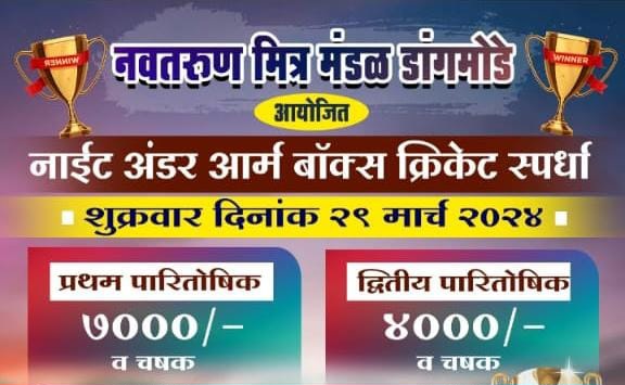 मसुरे प्रतिनिधी: मसुरे डांगमोडे येथे नवतरुण मित्र मंडळ डांगमोडे यांच्यावतीने शुक्रवार दिनांक २९ मार्च रोजी रात्री ७ वाजता पासून नाईट अंडर आर्म बॉक्स क्रिकेट स्पर्धेचे आयोजन करण्यात आलं आहे. या स्पर्धेसाठी पारितोषिक प्रथम क्रमांक रोख रुपये ७०००/- द्वितीय ४०००/+ आणि प्रत्येकी भव्य चषक देण्यात येणार आहे. इच्छुक संघाने आपली नावे अक्षय ठाकूर मो. ८२७५३४ १८५४ कीवा कृष्णा चव्हाण यांच्याकडे नोंदवावीत असे आवाहन नवतरुण मित्र मंडळ डांगमोडे यांनी केले आहे.