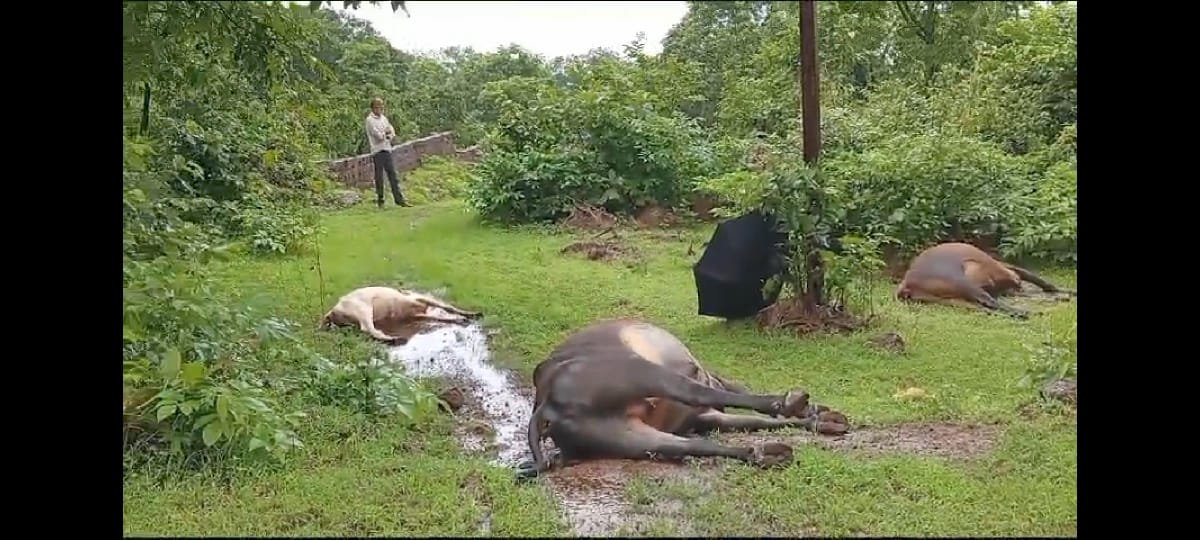बिळवस: बिळवस येथे ११ के. बी. चा करंट लागून शेतकऱ्याचे तीन बैल जागीच ठार जाल्याची दुःखद घटना घडली आहे. दररोज प्रमाणे शेतकरी चंदू पाताडे आपल्या बैलांना चरण्यासाठी घेऊन गेले होते. त्या ठिकाणी पोलावरील ११ kb ची तार कप मधून बाजूला सरकून लोखंडी पोलाला लागली होती. त्यामुळे पोलातून खालील पाण्यात विजेचा करंट वाहत होता. नेमके त्याच ठिकाणी तीन बैल गेल्याने विजेच्या करंट मुळे तीन बैल जागीच ठार झाले. त्या बैलांच्या मागून स्वतः शेतकरी चंदू पाताडे असल्याने त्यांना सुद्धा सौम्य करंट लागला आहे. सुदैवाने शेतकरी शेतकरी चंदू पाताडे बचावले आहेत. याबाबत योग्य ती चौकशी करून शेतकऱ्यांचे झालेले नुकसान तात्काळ भरून द्यावे अशी मागणी शेतकरी चंदू पाताडे यांच्या वतीने सामाजिक कार्यकर्ते राहुल सावंत यांनी केली आहे.