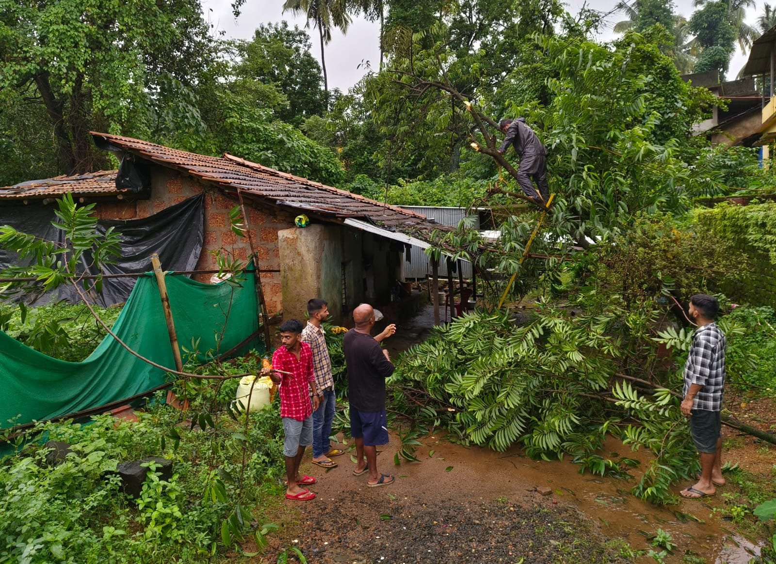 सावंतवाडी प्रतिनिधी: विठ्ठल मंदिरच्या मागील बाजूला असलेले मठकर या गरीब कुटुंबच्या घरासमोरील झाड मुळातून उरमळून घरावर पडत असताना रक्त दाता संघटनेचे अध्यक्ष देव्या सूर्याची व सामाजिक कार्यकर्ते बिट्टू यांनी सामाजिक बांधिलकीच्या रवी जाधव यांना फोन करून कल्पना दिली असता सामाजिक बदलीचे रवी जाधव व कार्याध्यक्ष संजय पेडणेकर तत्काळ घटनास्थळी दाखल होऊन सदर घरावर पडत असलेले झाड तात्काळ हटवल्यामुळे पुढील अनर्थ टळला. धनंजय परब हे मोठ्या धिराने झाडावर चढून झाडाच्या फांद्या तोडून ते धोकादायक झाड घरापासून दूर केले. यासाठी उमेश साटेलकर, विकी कदम, बिट्टू, देव्या सूर्याजी व मदन आडेलकर, यांचे सहकार्य लाभले. मठकर कुटुंबीयांनी सर्वांचे आभार मानले.