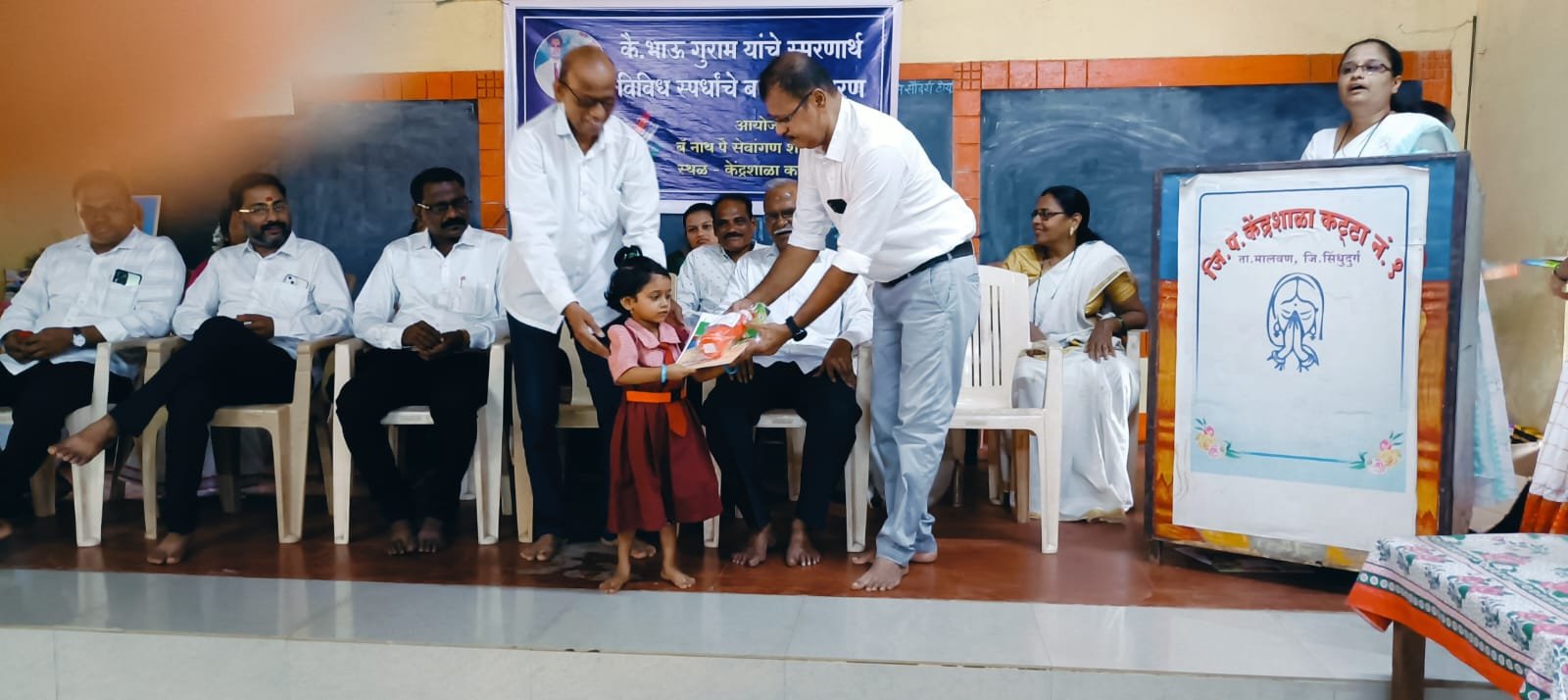 मसुरे प्रतिनिधी: केंद्र शाळा कट्टा येथे श्री दिलीप रामचंद्र गुराम यानी दिलेल्या आर्थिक सहकार्यातून संपन्न झालेल्या कै. भाऊ गुराम स्मरणार्थ विविध स्पर्धांचा बक्षीस समारंभ मान्यवरांचे उपस्थितीत संपन्न झाला. यावेळी विद्यार्थ्यानी समुहगीत सादर केले. प्रारंभी संपदा भाट मॅडम यानी शाळेच्या वतीने हस्ताक्षर, वक्तृत्व, रंगभरण, बडबड गीत वाचन या विविध स्पर्धामध्ये ७५ विद्यार्थी सहभागी झाल्याचे सांगितले . त्यातील ४५ स्पर्धकाना शैक्षणिक भेटवस्तू व प्रशस्तीपत्र तसेच सहभागी सर्व स्पर्धकाना प्रशस्ती पत्र व भेटवस्तू देण्यात आल्या. त्यासाठी प्रामुख्याने आर्थिक सहकार्य करणारे श्री दिलीप रामचंद्र गुराम यांचे शाळेच्या वतीने आभार मानले. तसेच ग्रामपंचायत वरची गुरामवाडी यांचे आभार मानण्यात आले.