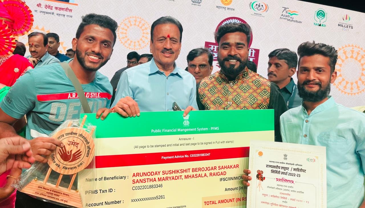 म्हसळा प्रतिनिधी : महाराष्ट्र सरकारच्या महाराष्ट्र राज्य ग्रामीण जीवनोन्नती अभियानांतर्गत उमेद लघुपट स्पर्धेत अरुणोदय सुशिक्षीत बेरोजगार सहकारी संस्था मर्या. खरसई या संस्थेने राज्यात चौथा क्रमांक पटकावला. सिडको प्रदर्शन केंद्र वाशी येथे झालेल्या महालक्ष्मी सरस कार्यक्रमात राज्याचे ग्रामविकास मंत्री गिरीश महाजन यांचे हस्ते रोख रक्कम पन्नास हजार, सन्मानचिन्ह व प्रमाणपत्र देण्यात आले.उमेद महाराष्ट्र राज्य ग्रामीण जीवनोन्नती अभियान अंतर्गत ग्रामीण भागातील स्वयं सहायता समूहातील महिलांच्या यशोगाथा दृकश्राव्य स्वरुपात लोकांपर्यंत पोहोचविण्याच्या हेतूने राज्यस्तरीय लघुपट व माहितीपट आणि चित्रफित निर्मितीच्या स्पर्धेचे आयोजन करण्यात आले होते. या स्पर्धेसाठी व्यावसायिक, हौशी चित्रपट निर्माते, व्हिडीओ निर्माते व युट्यूब ब्लॉगर यांनी सहभागी घेतला होता.संस्थेने किशोर शिताळे यांच्या संकल्पने नुसार राजलक्ष्मी महिला ग्रामसंघ काळसुरी यांच्या यशोगाथेवर आधारित उमेद या नावाने लघुपटाची निर्मिती आम्ही आहोत Struggler ह्या यूट्यूब चॅनेलच्या सहकार्याने केली असून लेखन दर्पण जाधव,दिग्दर्शन अजिंक्य भोसले,छायाचित्रीकरण धनंजय म्हात्रे यांनी केले.