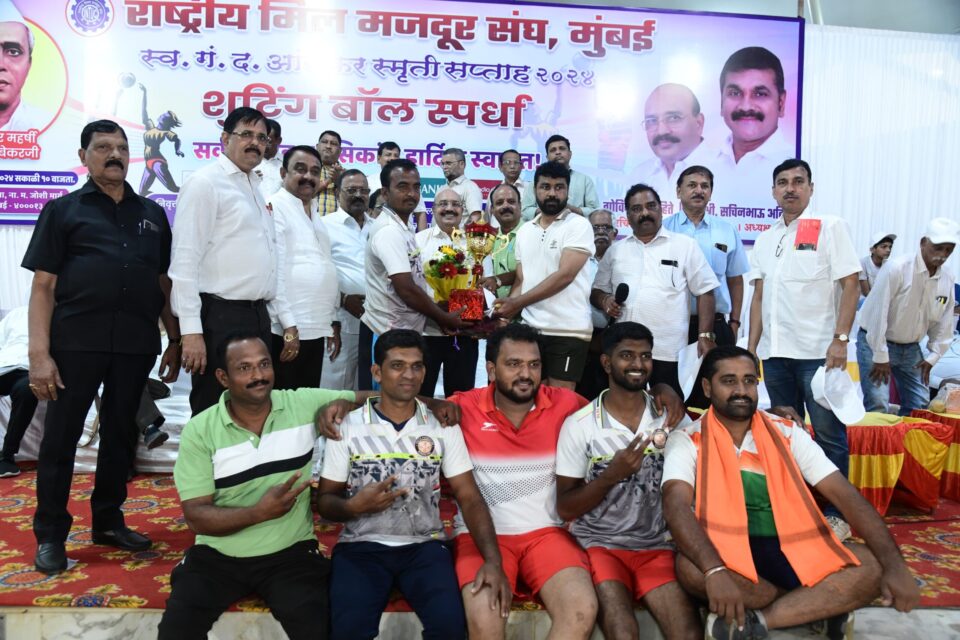 मसूरे प्रतिनिधी : राष्ट्रीय मिल मजदूर संघाच्या वतीने संघटनेचे संस्थापक कामगार महर्षी गं.द.आंबेकर यांच्या ६० व्या पुण्यस्मृती प्रित्यर्थ संघटनेचे अध्यक्ष आमदार सचिन अहिर,सरचिटणीस गोविंदराव मोहिते यांच्या पुढाकाराने ना.म.जोशी मार्ग,श्रमिक जिमखाना मुंबई येथे खेळविण्यात आलेल्या स्पर्धेत सोलापूर जि.युथ फेडरेशन मनेराजुरी संघ अजिंक्य ठरला. कावेरी नगर, पुणे हा संघ उपविजेता ठरला. मुंबईतील १४ तर राज्यातील १२ असे २६ संघ या स्पर्धेत सहभागी झाले होते. विजयी संघाला आंबेकर चषक-११ हजार रुपये रोख आणि उपविजयी संघाला आंबेकर चषक-८ हजार रुपये रोख पारितोषिके,उपांत्य पराभूत संघाना प्रत्येकी ५ हजार रोख व चषक देऊन सरचिटणीस गोविंदराव मोहिते, खजिनदार निवृत्ती देसाई, उपाध्यक्ष क्रीडा प्रमुख सुनिल बोरकर यांच्या हस्ते प्रदान करण्यात आला. सामन्याचे उदघाटन शुटिंगबॉल असोसिएशनचे अध्यक्ष माजी आमदार श्याम सावंत, सरचिटणीस दीपक सावंत आणि युनियन उपाध्यक्ष माजी नगरसेवक सुनिल अहिर यांच्या हस्ते पार पडले. उपाध्यक्ष अण्णा शिर्सेकर,बजरंग चव्हाण, सेक्रेटरी शिवाजी काळे, साई निकम, कार्यालयीन अधिक्षक मधु घाडी आदी त्या वेळी उपस्थित होते.