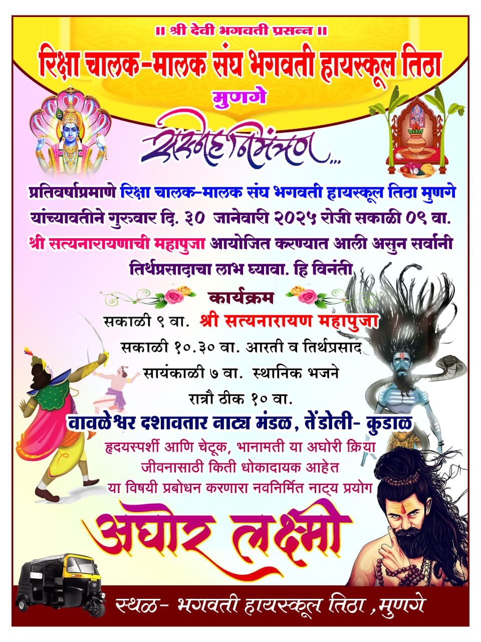 मालवण प्रतिनिधी: रिक्षा चालक-मालक संघ भगवती हायस्कूल तिठा मुणगे – देवगड यांच्यावतीने ३० जानेवारी रोजी सकाळी ०९ वा. श्री सत्यनारायणाची महापुजा आयोजित करण्यात आली आहे. सकाळी १०.३० वा. आरती व तिर्थप्रसाद, सायंकाळी ७ वा. स्थानिक भजने, रात्रौ ठीक १० वा.वावळेश्वर दशावतार नाट्य मंडळ, तेंडोली- कुडाळ यांचा ‘अघोर लक्ष्मी’ हा दशावतार नाट्यप्रयोग होणार आहे. उपस्थितीचे आवाहन करण्यात आले आहे.