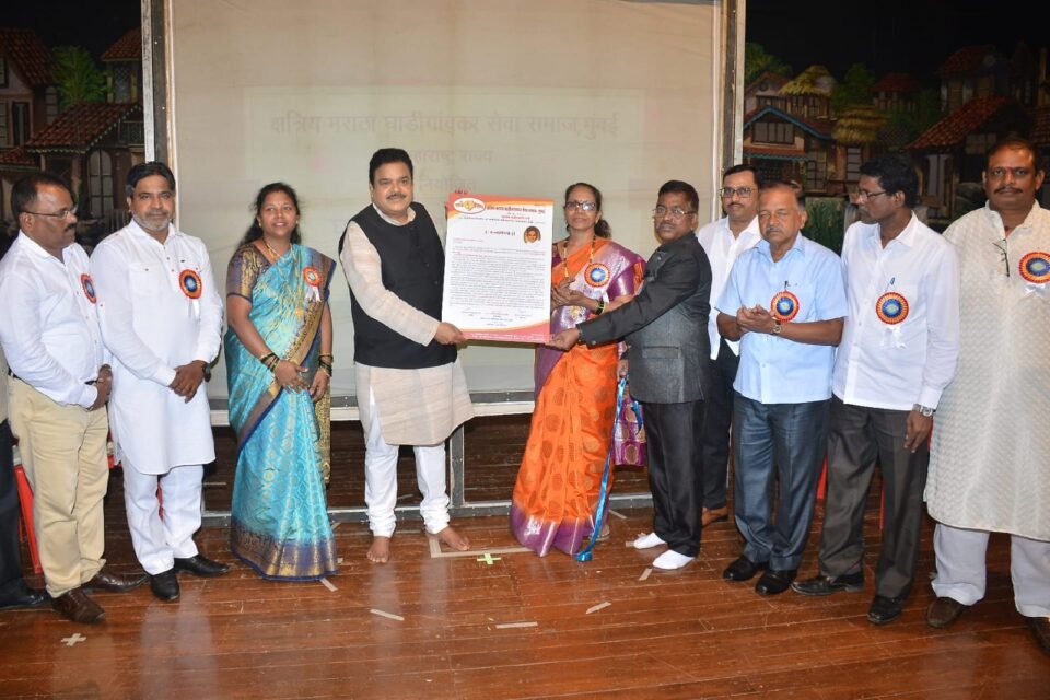 फोटो: मुंबई – मानपत्राचे प्रतिकात्मक अनावरण करताना अशोक हांडे बाजूला घनश्याम गांवकर, आर के घाडीगांवकर, राजेश हाटले, संजना घाडी, रघुवीर वायंगणकर, संजय घाडी, लक्ष्मण घाडीगांवकर, सुहास गांवकर, रश्मी घाडीगांवकर आदि.
