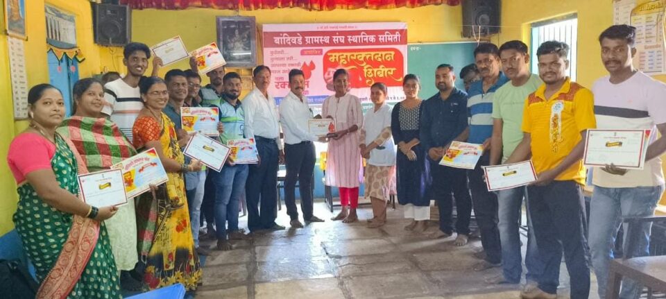 मसुरे प्रतिनिधी: बांदिवडे ग्रामस्थ संघाच्या वतीने बांदिवडे शाळा नंबर २ येथे आयोजित करण्यात आलेल्या रक्तदान शिबिरामध्ये २६ दात्यांनी रक्तदान करत सामाजिक बांधिलकी जपली. शिवजयंती उत्सवा निमित्त सदर कार्यक्रमाचे आयोजन बांदिवडे पालेवाडी येथे करण्यात आले होते. कार्यक्रमाचा प्रारंभ दीप प्रज्वलन करून झाला. यावेळी सरपंच आशु मयेकर, ग्रामस्थ संघांचे अध्यक्ष आनंद परब, वैद्यकीय अधिकारी पल्लवी सुरवसे,प्रांजली परब, रक्तपेढी तंत्रज्ञ विशाल जाधव, नेहा परब, तंटामुक्ती अध्यक्ष शाहूलखन बांदिवडेकर, बांदिवडे उपकेंद्राच्या सायली गोंधळेकर, दीप्ती पोवळे, यादव,शामला आईर,पोलीस पाटील संदेश पवार, प्रियंका सावंत, ग्रामस्थ संघाचे उपाध्यक्ष विलास परब, सचिव उदय सावंत, सहसचिव प्रशांत परब, खजिनदार अजय घाडीगावकर, प्रफुल्ल प्रभू, उमेश परब, शंकर आईर, रामचंद्र माळकर, सतीश आईर, संदीप घाडीगावकर, प्रकाश घाडीगावकर, प्रमोद परब, मंगेश राणे, गोविंद घागरे,सुनील घाडीगावकर, ऋषिकेश जाधव, प्रसाद वरक,जाधव सर आदी ग्रामस्थ उपस्थित होते शिबिर यशस्वी करण्यासाठी मिलिंद चव्हाण यांचे विशेष सहकार्य लाभले. सर्व रक्तदात्यांना सन्मान चिन्ह आणि प्रशस्तीपत्र बांदिवडे ग्रामस्थ संघाच्या वतीने प्रदान करण्यात आली. आभार अध्यक्ष आनंद परब यांनी मानले.