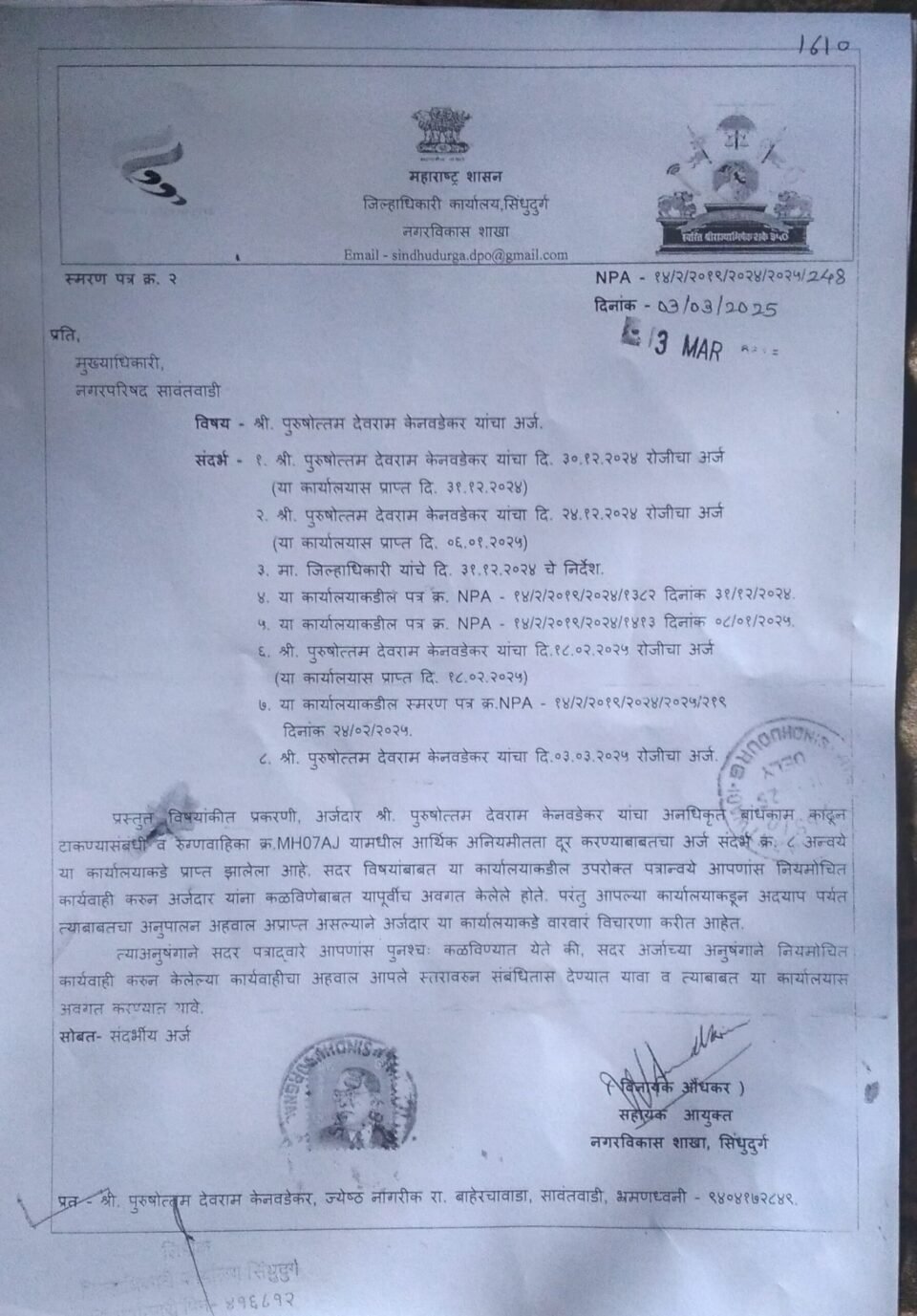 सावंतवाडी प्रतिनिधी: महाराष्ट्र शासनाने जनतेचे जीवन सुकर यावे म्हणून १०० दिवसांचा कृतिशील सात कलमी कार्यक्रम राज्यभर राबविला जात आहे. यातील एक कलम माणने नागरीकांच्या तक्रारीचा निपटारा त्वरीत करणे, सावंतवाडी शहरातील एक नागरीक श्री. पुरुषोत्तम देवराम केनवडेकर यांना शहरातील कारागृह जवळ बक्षिस पत्राने दिलेल्या जामिनावर अतिक्रम झाले हे निवर्शनास आले. ही जमिन सामाजिक बांधीलकीसाठी बक्षीस पत्राने वृध्दाश्रम, अनाथ आश्रम , शाळा, मुला मुलीचे वसतीगृह बांधण्यासाठी के. वैषराम संतु केनवडेकर यांनी स्वतःकडील तीन सुठे जमीन बक्षीस पत्राने बक्षीस म्हणून दिली आहे. या जमीनीवर विनापरवाना अनधिकृत बांधकाम झाले आहे. हे अनधिकृत बांधकाम काढून टाकण्यासबंधी मुख्याधिकारी सावंतवाडी नगरपरिषद यांच्याकडे निवेदन सादर केले. अनधिकृत बांधकाम आहे हे नगरपरिषद सावंतवाडी मान्य करूनही ते काढून टाकण्यासंबंधी विरंगाई करीत असल्याने सदरील बाब जिल्हाधिकारी महोदय यांच्या निवेदनाद्वारे निदर्शनास आणली. या निवेदनावर जिल्हाधिकारी महोदय सिंधुदुर्ग यांनी दि. ३१/१२/२०२४ मुख्याधिकारी सावंतवाडी नगरपरिषद यांना पत्र देवून आपल्या स्तरावर बांधकामाची पहाणी करून सदरील बांधकाम अनधिकृत असल्यास ते काढून टाकण्याविषयी कार्यवाही करण्यात यावी व त्याबाबतचा अनुपालन आहवाल या कार्यालयास सादर करण्यात यावा परंतु अद्यापही मुख्याधिकारी सावंतवाडी नगरपरिषद हे बांधकाम काढून टाकण्याबाबत कुचराई, अनियमितता, विरंगाई करीत आहे. या अनधिकृत बांधकाम संबंधी उपविभागीय अधिकारी (महसूल) तथा उप विभागीय दंडाधीकारी, उप विभाग सावंतवाडी यांनी तात्काळ कारवाई करून अंतिम अहवाल सात दिवसात सादर करावा असे निर्देश दिले आहेत. असेच निर्देश सहाय्यक आयुक्त, नगरविकास शाखा, जिल्हाधीकारी कार्यालय सिंधुदुर्ग यांनी दिले आहेत, ह्या निर्देशांवर मुख्याधिकारी सावंतवाडी नगरपरिषद यांनी कार्यवाही सोडाच अर्जदारास उत्तर देण्याचेही सौजन्य दाखवलेले नाही.
