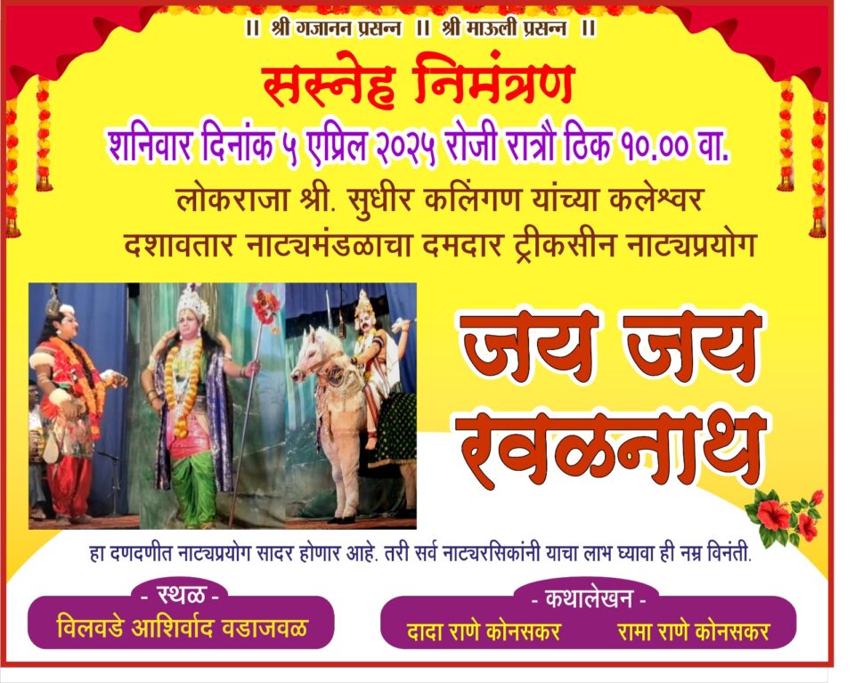 सावंतवाडी प्रतिनिधी: विलवडे आशिर्वाद वड येथे सालाबादप्रमाणे शनिवार ५ एप्रिल रोजी रात्री १० वाजता लोकराजा सुधीर कलिंगड प्रस्तुत श्री कलेश्वर दशावतार नाटयमंडळ (नेरूर) यांचा ‘जय जय रवळनाथ’ हा ट्रिकसिनयुक्त नाटयप्रयोग होणार आहे. नाट्यरसिकांनी याचा लाभ घ्यावा असे आवाहन शिवसेनेचे उपजिल्हा प्रमुख तथा माजी उपसभापती विनायक दळवी यानी केले आहे.