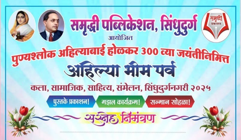 मसुरे प्रतिनिधी: समृद्धी पब्लिकेशन, सिंधुदुर्ग आयोजित पुण्यश्लोक अहिल्याबाई होळकर ३०० व्या जयंतीनिमित्त अहिल्या भीम पर्व कला, सामाजिक, साहित्य, संमेलन, सिंधुदुर्गनगरी येथे संमेलनाचे आयोजन करण्यात आले आहे. या कार्यक्रमात पुस्तके प्रकाशन गझल सादरीकरण व विशेष सन्मान सोहळ्याचे आयोजन करण्यात आले आहे. विविध क्षेत्रातील व्यक्तींचा व संस्थांचा कौतुक सन्मान सोहळा रविवार दि. १ जून २०२५ रोजी सकाळी ११ वाजता स्थळ – दर्पणकार बाळशास्त्री जांभेकर पत्रकार भवन जिल्हा बँक समोर ओरोस, मुख्यालय सिंधुदुर्गनगरी येथे