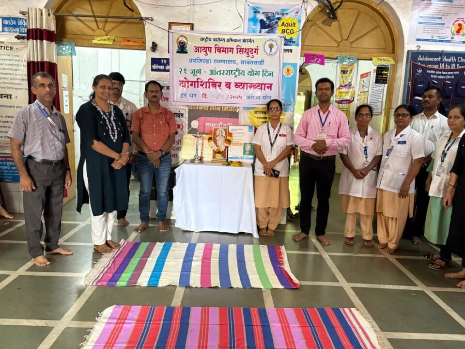 यावेळी सावंतवाडी उपजिल्हा रुग्णालयाचे वैद्यकीय अधिक्षक डॉ. ज्ञानेश्वर ऐवळे, डॉ. धीरज सावंत, डॉ. चौगुले, डॉ. निलेश अटक, सावंतवाडी उपजिल्हा रुग्णालयाचे आयुष वैद्यकीय अधिकारी डॉ. सागर जाधव, एन सी डी विभागाच्या समुपदेशक अदिती कशेळीकर, सिस्टर आल्मेडा आदी उपस्थित होते. यावेळी डॉ निलेश अटक यांनी योगाचे महत्त्व आणि दैनंदिन आवश्यकता व मानसिकता याबद्दल माहिती देऊन