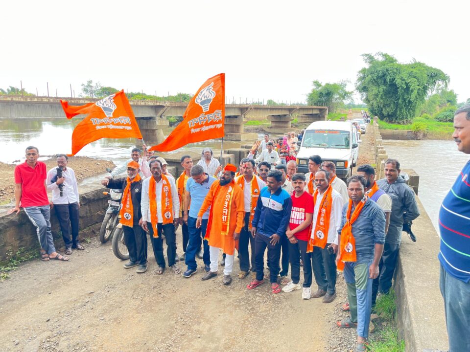फोटो ओळी – बाचणी ता.कागल येथे दुधगंगानदीवरील नवीन पुलाचे काम तात्काळ सुरू करावे यासाठी शिवसेना ठाकरे गटाकडून आंदोलन करताना संभाजी भोकरे,अशोक पाटील आदी शिवसैनिक. छायाचित्र ः सागर लोहार,साके