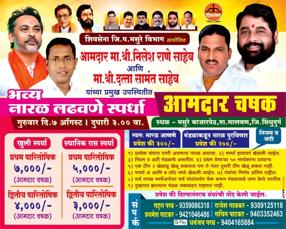 मसुरे प्रतिनिधी: शिवसेना जि. प. मसुरे विभागाच्या वतीने 7 ऑगस्ट रोजी दुपारी तीन वाजता मसुरे बाजारपेठ येथे आमदार चषक खुली भव्य नारळ लढवणे स्पर्धेचे आयोजन करण्यात आले आहे. आमदार निलेश राणे आणि शिवसेना जिल्हाप्रमुख दत्ता सामंत यांच्या प्रमुख उपस्थितीत स्पर्धा होणार आहे. स्पर्धा दोन गटात होणार असून खुल्या गटासाठी प्रथम पारितोषिक ७ हजार रुपये व द्वितीय पारितोषिक ४ हजार रुपये व प्रत्येकी चषक तर स्थानिक रास स्पर्धेसाठी प्रथम पारितोषिक ५ हजार रुपये, द्वितीय पारितोषिक ३ हजार रुपये व प्रत्येकी चषक देण्यात येणार आहे. स्पर्धेसाठी प्रवेश फी ठेवण्यात आली असून प्रवेश फी दिल्यानंतरच संघाची नोंद केली जाईल. अधिक माहितीसाठी राजेश गावकर (9309125118), राहुल परब, प्रथमेश पाटकर , सचिन पाटकर, धनंजय परब येथे संपर्क साधावा.