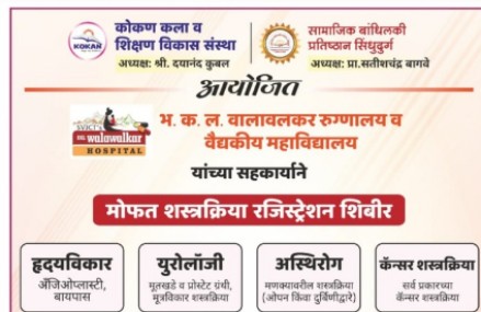 सावंतवाडी प्रतिनिधी: सामाजिक बांधिलकी प्रतिष्ठान व कोकण कला व शिक्षण विकास संस्था यांच्या संयुक्त विद्यमाने सावंतवाडी उपजिल्हा रुग्णालय येथे दिनांक २० जानेवारी २०२६ रोजी सकाळी १० ते सायंकाळी ४ वाजेपर्यंत भव्य मोफत आरोग्य तपासणी व शस्त्रक्रिया नोंदणी शिबिराचे आयोजन करण्यात आले आहे. या शिबिराचे उद्घाटन अनेक मान्यवरांच्या हस्ते होणार असून सामाजिक बांधिलकी प्रतिष्ठानचे अध्यक्ष प्रा. श्री. सतीश बागवे व कोकण संस्थेचे अध्यक्ष, सामाजिक कार्यकर्ते श्री. दयानंद कुबल यांची प्रमुख उपस्थिती लाभणार आहे. या शिबिरासाठी भ. क. ल. वालावलकर रुग्णालय व वैद्यकीय महाविद्यालय, डेरवण यांचे सहकार्य लाभले आहे.