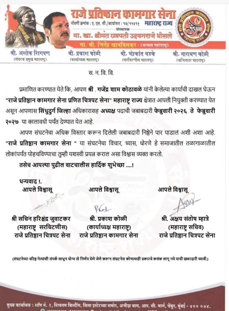 यावेळी ज्येष्ठ कलाकार व लेखक चंद्रहास राऊळ यांची सचिवपदी, जय गणेश विष्णू गावकर यांची उपाध्यक्षपदी, प्राजक्ता परशुराम मोरजकर यांची महिला अध्यक्षपदी, सुशील तानाजी बिर्जे यांची तालुकाध्यक्षपदी, मनाली मनोज राऊत यांची महिला शहर अध्यक्षपदी, रुचिता रामदास आईर यांची सल्लागारपदी तसेच हेमांगी प्रवीण माने, सुरेखा दासू पवार, नीलम राजन कुंभार, सुमित सुधीर नाईक आणि रसिका रामदास आईर यांची सदस्यपदी निवड जाहीर करण्यात आली.या सोहळ्यास सावंतवाडीचे नगरसेवक श्री सुधीर आरिवडेकर, श्री बबन साळगावकर, श्री नारायण सावंत तसेच शिक्षक, पालक, महिला मंडळाच्या सदस्या, विविध पुरस्कारार्थी आणि राजे प्रतिष्ठानचे पदाधिकारी मोठ्या संख्येने उपस्थित होते.कार्यक्रमात सन्मान, उत्साह आणि सामाजिक बांधिलकीची जाणीव यांचा सुंदर संगम पाहायला मिळाला. श्री गजेंद्र शाम कोठावळे यांच्या नियुक्तीमुळे सिंधुदुर्ग जिल्ह्यातील सांस्कृतिक, चित्रपट आणि कामगार क्षेत्राला नवी दिशा व बळ मिळेल, असा विश्वास उपस्थित मान्यवरांनी व्यक्त केला.