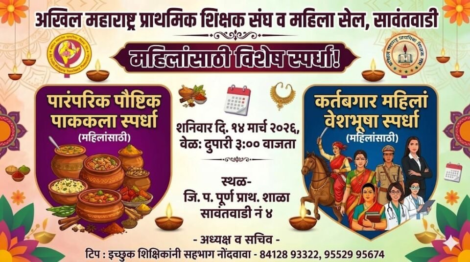 सावंतवाडी प्रतिनिधी: अखिल महाराष्ट्र प्राथमिक शिक्षक संघ शाखा सावंतवाडीच्या वतीने दरवर्षीप्रमाणे जागतिक महिला दिन साजरा होणार आहे. हा कार्यक्रम शनिवार दिनांक १४ मार्च २०२६ रोजी होणार आहे दुपारी साडेतीन वाजता कार्यक्रमाचे उदघाटन होणार आहे .या कार्यक्रमासाठी दोन प्रकारच्या स्पर्धांचे आयोजन करण्यात आलेले आहे .महिलांसाठी पाककला स्पर्धा व दुसरा विषय कर्तबगार महिला वेशभूषा स्पर्धां चे आयोजन करण्यात आलेले आहे. या कार्यक्रमासाठी सावंतवाडीच्या नूतन सभापती सन्माननीय सुश्मिता जाधव व उपसभापती गौरव मुळीक व सावंतवाडी पंचायत समितीचे गटविकास अधिकारी वासुदेव नाईक, गटशिक्षणाधिकारी परब मॅडम तसेच महिला सेलच्या जिल्हाध्यक्षा तेजस्विता वेंगुर्लेकर व जिल्हा सचिव माळी मॅडम, आणि जिल्हा कार्यकारणीचे सर्व सदस्य उपस्थित राहणार आहेत.