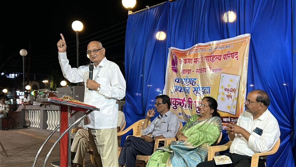 सावंतवाडी प्रतिनिधी: सावंतवाडीशी माझं नातं वेगळं आहे. कवीवर्य वसंत सावंत, बा. भ. बोरकर यांच्यासह येथील टी एन नाईक, दीनकर धारणकर, तात्या भांगले, विद्याधर भागवत, हरिहर आठलेकर, विद्यार्थी महेश केळुसकर, आदींसह मी या भूमीत काम केलं. असे सांगत सावंतवाडीमध्ये एस.पी. के. महाविद्यालयात नोकरी करत असताना घालवलेल्या १७ वर्षांच्या आठवणी प्राचार्य डॉ.एच. व्ही. देशपांडे यांनी जागृत केल्या. पुस्तक प्रकाशन सोहळ्यात पुढे बोलताना “सुंदरवाडी, दक्षिण कोकणच्या निसर्गाशी कविता एकरूप झालेली असून त्याचं प्रतिबिंब बकुळीची फुले या काव्यसंग्रहात दिसत आहे” असे गौरवोद्गार त्यांनी काढले. जुन्या कवींच्या खांद्यावर उभे राहून नवे कवी जग पाहत आहेत. कविता लिहिणं हे वाटते तेवढी सोप्पी गोष्ट नाही. शब्दांना आपल्या मुठीत पकडण्याचं काम कवी करतो. जगाच्या इतिहासात काव्य हे पहिलं लिहिलं गेलं असून कवितेचा अन् मानवी जीवनाचा संबंध दृढ आहे. असे सांगत “छंदमुक्त कवितेच्या वातावरणात वृत्तबद्ध काव्य लिहिणाऱ्या दीपक पटेकर यांचा गौरव करायला हवा”. असे कवी दीपक पटेकर यांच्या “बकुळीची फुले” या काव्यसंग्रहाच्या प्रकाशन सोहळ्या प्रसंगी बोलताना प्रमुख अतिथी साहित्यिक प्राचार्य डॉ. एच. व्ही. देशपांडे म्हणाले.
