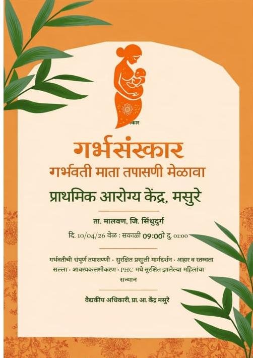 मसुरे प्रतिनिधी: प्राथमिक आरोग्य केंद्र मसुरे आणि आयुष्यमान आरोग्य मंदिर मसुरे यांच्या वतीने माझं गाव आरोग्य संपन्न गाव अंतर्गत गर्भसंस्कार गर्भवती माता तपासणी मेळावा 13 एप्रिल रोजी सकाळी दहा ते दोन या वेळात मसुरे प्राथमिक आरोग्य केंद्र येथे आयोजित करण्यात आला आहे. यावेळी गरोदरपणातील आरोग्य तपासणी व मार्गदर्शन, प्रसुती पूर्व व प्रसुती पश्चात घेण्याची काळजी, गरोदरपणातील योगासने, प्राणायाम व संगीत थेरपी, शासकीय लाभ व योजना, प्रसूती नियोजन व फनी गेम याबाबत मान्यवर मार्गदर्शन करणार आहेत. यावेळी काही मातांचा सत्कारही करण्यात येणार आहे. तरी सर्व गर्भवती मातानी या मेळाव्याचा लाभ घ्यावा असे आवाहन आयुष्यमान आरोग्य मंदिर मसुरे आणि मसुरे प्रथमिक आरोग्य केंद्राच्या वतीने करण्यात आले आहे.