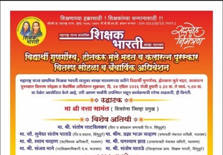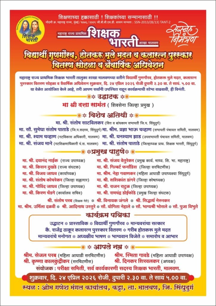 मसुरे प्रतिनिधी: महाराष्ट्र राज्य प्राथमिक शिक्षक भारती, तालुका शाखा मालवणच्या वतीने २४ एप्रिल २०२६ रोजी दुपारी २.३० ते सायं. ५.०० वाजेपर्यंत ओम गणेश मंगल कार्यालय, कट्टा येथे विशेष कार्यक्रमाचे आयोजन करण्यात आले आहे. यामध्ये विद्यार्थी गुणगौरव, होतकरू विद्यार्थ्यांना मदत आणि ‘कलारत्न पुरस्कार’ वितरण सोहळ्यासह शाखेचे त्रैवार्षिक अधिवेशन पार पडणार आहे.या कार्यक्रमाचे उद्घाटन शिवसेना जिल्हा प्रमुख श्री. दत्ता सामंत यांच्या हस्ते होणार आहे. विशेष अतिथी म्हणून जि.प. सिंधुदुर्गचे बांधकाम सभापती श्री. संतोष साटविलकर पंचायत समिती सभापती सौ प्रज्ञा चव्हाण, उपसभापती घनश्याम झाड, जिल्हा परिषद सदस्या सौ सुमेधा पाताडे, गटविकास अधिकारी श्याम चव्हाण, गटशिक्षणाधिकारी संजय माने यांच्यासह जिल्ह्यातील विविध मान्यवर, प्रशासकीय अधिकारी आणि शिक्षक भारतीचे पदाधिकारी उपस्थित राहणार आहेत.या सोहळ्यात गुणवंत विद्यार्थ्यांचा सत्कार, कै. राजेंद्र ठाकूर कलारत्न पुरस्काराचे वितरण, आदर्श शाळा पुरस्कार आणि गरजू विद्यार्थ्यांना शैक्षणिक मदत दिली जाणार आहे. शिक्षक भारती सिंधुदुर्ग जिल्हा अध्यक्ष संतोष पाताडे, मालवण शाखेचे अध्यक्ष श्री. दिनकर शिरवलकर व सरचिटणीस श्री. कृष्णा कालकुंद्रीकर यांनी सर्व संबंधित शिक्षक आणि पालकांना या सोहळ्यास मोठ्या संख्येने उपस्थित राहण्याचे आवाहन केले आहे.