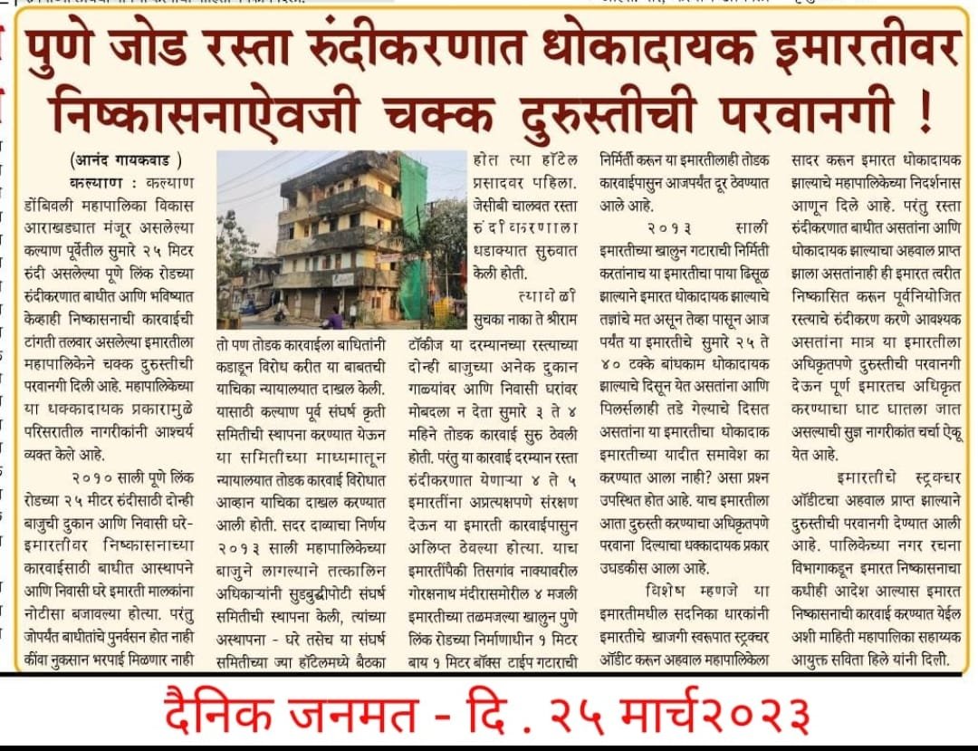 कल्याण प्रतिनिधी: (आनंद गायकवाड ): – कल्याण डोंबिवली महापालिकेच्या विकास आराखड्यात मंजूर असलेल्या कल्याण पूर्वेतील सुमारे २५ मिटर रुंदी असलेल्या पूणे लिंक रोडच्या रुंदीकरणात बाधीत असलेल्या आणि भविष्यात केव्हाही निष्कासनाची कारवाईची टांगती तलवार असलेल्या इमारतीला महापालिकेने चक्क दुरुस्तीची परवानगी दिली आहे . महापालिकेच्या या धक्कादायक प्रकारामुळे परिसरातील नागरीकांत पालिकेच्या या कारभाराविषयी संशय व्यक्त केला जात असून या बाबत प्रकाराबाबत नागरीकांत उलट – सुलट चर्चेला उधाण आले आहे .सन २०१० साली पूणे लिंक रोडच्या २५ मिटर रुंदीसाठी रोडच्या दोन्ही बाजुची दुकान आणि निवासी घरे – इमारतीवर निष्कासनाच्या कारवाईसाठी बाधीत अस्थापना मालक आणि निवासी घरे इमारती मालकांना नोटीसा बजावल्या होत्या परंतु जो पर्यंत बाधीतांचे पुनर्वसन होत नाही कींवा नुकसान भरपाई मिळणार नाही तो पण तोडक कारवाईला बाधितांनी कडाडून विरोध करीत या बाबतची याचिका मा . न्यायालयात दाखल करण्यात आली होती . या साठी कल्याण पूर्व संघर्ष कृती समितीची स्थापना करण्यात येऊन या समितीच्या माध्यमातून मा . न्यायालयात तोडक कारवाई विरोधात आव्हान याचिका दाखल करण्यात आली होती परंतु सदर च्या दाव्याचा निर्णय सन २०१३ साली महापालिकेच्या बाजुने लागल्याने महापालिकेच्या तद्कालिन अधिकार्यांनी सुडबुद्धी पोटी ज्यांनी संघर्ष कृती समितीची स्थापना केली त्यांच्याच अस्थापना आणि घरे तसेच या संघर्ष कृती समितीच्या ज्या हॉटेल मध्ये बैठका होत त्या हॉटेल प्रसादवर पहिला जेसीबी चालवत रस्ता रुंदीकरणाला धडाक्यात सुरुवात केली होती . त्या वेळी सुचका नाका ते श्रीराम टॉकीज या दरम्यानच्या रस्त्याच्या दोन्ही बाजुच्या अनेक दुकान गाळ्यांवर आणि निवासी घरांवर कसल्याही प्रकारचा मोबदला न देता सुमारे ३ ते ४ महिने निर्दयपणे महापालिकेने तोडक कारवाई सुरु ठेवली होती . परंतु या कारवाई दरम्यान रस्ता रुंदीकरणात येणाऱ्या ४ ते ५ इमारतींना अप्रत्यक्षपणे संरक्षण देऊन या इमारती कारवाई पासुन अलिप्त ठेवल्या होत्या त्या आजतागायत कायम आहेत . याच इमारतींपैकी तिसगांव नाक्यावरील गोरक्षनाथ मंदीरासमोरील ४ मजली इमारतीच्या तळमजल्या खालुन पुणे लिंक रोडच्या निर्माणाधीन १ मिटर बाय १ मिटर बॉक्स टाईप गटाराची निर्मिर्ती करून या इमारतीलाही तोडक कारवाई पासुन तेव्हा पासून आज पर्यंत दूर ठेवण्यात आले आहे . वास्तविक पहाता सन २०१३ साली इमारतीच्या खालुन गटाराची निर्मिती करतांनाच या इमारतीचा पाया ढिसूळ झाल्याने इमारत धोकादायक झाल्याचे तज्ञांचे मत असून तेव्हा पासून आज पर्यंत या इमारतीचे सुमारे २५ ते ४० टक्के बांधकाम धोकादाय झाल्याचे दिसू