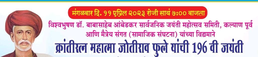 कल्याण प्रतिनिधी: (आनंद गायकवाड):– विश्वरत्न डॉ बाबासाहेब आंबेडकर जयंती महोत्सव समिती कल्याण पूर्व आणि मैत्रेय संगत या सेवाभावी संस्थेच्या संयुक्त विद्यमाने उद्या कल्याण पूर्वेत महात्मा ज्योतिबा फुले यांची जयंती मोठ्या उत्साहात साजरी करण्यात येणार असून या निमित्त महात्मा फुले यांच्या जिवनावर आधारी ‘भिमसांज’ या एकपात्री नाट्य प्रयोगाचे आयोजन करण्यात आले आहे .या वर्षीच्या आंबेडकर जयंती उत्सव समितीच्या अध्यक्षा आयु . सिंधुताई मेश्राम यांच्या अधिपत्त्याखाली ‘भिमोत्सव -२०२३ ‘ या अंतर्गत ९ एप्रिल ते १४ एप्रिल २०२३ या कालावधीत विविध समाज प्रबोधनात्मक कार्यक्रमांचे आयोजन करण्यात आले आहे. याचाच एक भाग म्हणून उद्याच्या महात्मा ज्योतीबा फुले यांच्या जयंती दिनी कबीर रंजन जगताप प्रस्तुत महात्मा ज्योतीबा फुले यांच्या संघर्षमय जिवनावर आधारीत ‘भिमसांज’ या एकपात्री प्रयोगासह प्रबोधनात्मक गित – संगित कार्यक्रमाचे आयोजन करण्यात आले आहे. क्रीएटीव्ह चौक दुर्गामाता मंदीरा जवळ, कोळसेवाडी कल्याण पूर्व येथे उद्या सायं. ७ वाजता आयोजित करण्यात आलेल्या या समाज प्रबोधनात्मक कार्यक्रमास तमाम नागरीकांनी उपस्थित रहाण्याचे आवाहन जयंती उत्सव समितीच्या वतीने अध्यक्षा आयु. सिधुताई मेश्राम तसेच मैत्रेय संगत संस्थेचे अध्यक्ष रविंद्र रिपोटे यांनी एका पत्रकाद्वारे केले आहे.