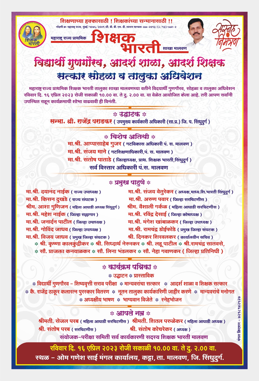 मसुरे प्रतिनिधी: महाराष्ट्र राज्य प्राथमिक शिक्षक भारती तालुका शाखा मालवण च्या वतीने विद्यार्थी गुणगौरव, आदर्श शाळा, आदर्श शिक्षक, मान्यवर सत्कार सोहळा व तालुका अधिवेशन ओम गणेश साई मंगल कार्यालय कट्टा तालुका मालवण येथे रविवार दिनांक 16 एप्रिल 2023 रोजी सकाळी दहा ते दुपारी दोन या वेळेत आयोजित करण्यात आले आहे. या कार्यक्रमाचे उद्घाटन उपमुख्य कार्यकारी अधिकारी जिल्हा परिषद सिंधुदुर्ग चे श्री राजेंद्र पराडकर यांच्या हस्ते होणार असून विशेष अतिथी म्हणून मालवण पंचायत समितीचे गटविकास अधिकारी माननीय श्री आप्पासाहेब गुजर गटशिक्षणाधिकारी मालवण माननीय श्री संजय माने, जिल्हाध्यक्ष प्राथमिक शिक्षक भारती सिंधुदुर्ग संतोष पाताडे हे असणार असून प्रमुख पाहुणे माननीय दयानंद नाईक, किसन दुखंडे, आशा गुणीजन, महेश नाईक, जनार्दन पाटील, गोविंद जाधव, विजय जाधव, संजय वेतुरेकर, अरुण पवार,वैशाली गरकळ, रवींद्र देसाई, मंगेश खांबाळकर, रामचंद्र डोईफोडे, दिनकर शिरवलकर, कृष्णा कालकुंदरीकर, सिद्धार्थ नेरुळकर, लहू पाटील, रामचंद्र सातवसे, प्राजक्ता कन्याळकर, लीना भंडलकर, नेहा गव्हाणकर आदी उपस्थित राहणार आहेत. कार्यक्रमाचा लाभ घेण्याचे आवाहन श्रीमती सेजल परब, श्रीमती शितल परुळेकर, श्री संतोष कोचरेकर, संतोष परब आणि शिक्षक भरती शाखा मालवण च्या वतीने केले आहे.