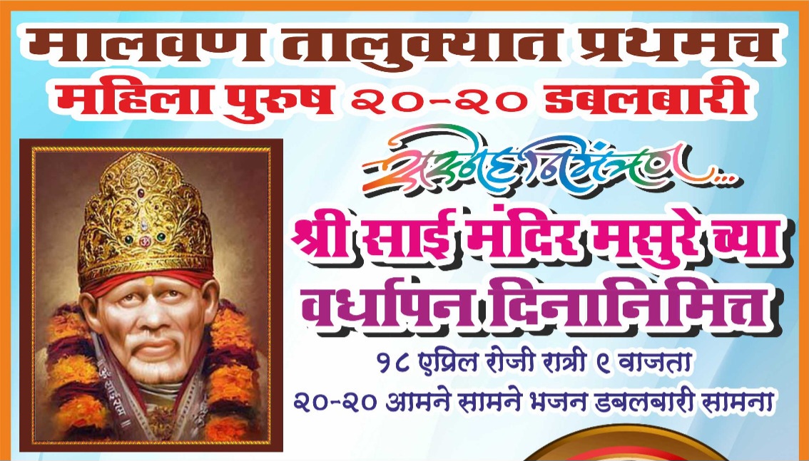 मसुरे प्रतिनिधि: मालवण तालुक्यात प्रथमच महिला पुरुष २०-२० भजन डबलबारी सामना श्री साई मंदिर मसुरे रविवार बाजारपेठ येथे आयोजित केला आहे. हा सामना बुवा श्री श्रीकांत शिरसाटओम चैतन्य गगनगिरी प्रसादिक भजन मंडळ मुंबई. तालुका वैभववाडी.गुरुवर्य कै.चंद्रकांत बुवा कदम यांचे शिष्य. पखवाज – अमोल पांचाळ, तबला – महेश तळेकर.