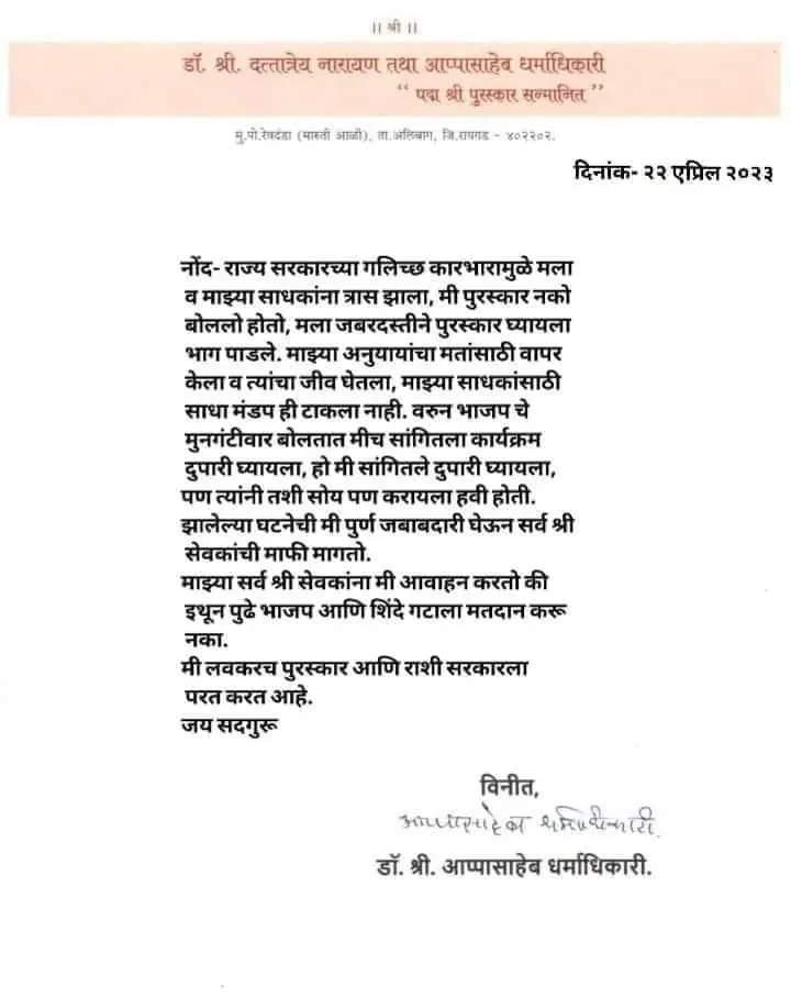 सिंधुदुर्ग प्रतिनिधी: खारघर प्रकरणात श्री सदस्यांच्या मृत्यू नंतर बनावट पत्र व्हायरल झाले होते. त्यानंतर त्या प्रकरणी रायगड पोलिसांनी पुण्यात मोठी कारवाई केली आहे. गेल्या काही दिवसांपूर्वी डॉ. आप्पासाहेब धर्माधिकारी यांना महाराष्ट्र सरकारच्या वतीने महाराष्ट्र भूषण हा पुरस्कार देण्यात आला होता. खारघर येथे केंद्रीय मंत्री अमित शाह, मुख्यमंत्री एकनाथ शिंदे, उपमुख्यमंत्री देवेंद्र फडणवीस यांच्यासह लाखोंच्या संख्येने श्री सदस्य उपस्थित होते. त्यामध्ये उष्माघाताने १४ श्री सदस्यांचा मृत्यू झाल्याची बाब समोर आली होती. त्यानंतर संपूर्ण राज्यात खळबळ उडाली होती. त्याच दरम्यान डॉ. आप्पासाहेब धर्माधिकारी यांनी त्यांच्या लेटरहेडवर आपलं म्हणणे मांडलं होतं. त्यामध्ये त्यांनी श्री सदस्यांच्या मृत्यूप्रकरणी दु:ख व्यक्त केले होते. त्यानंतर त्याच पत्राचा आधार घेऊन? सोशल मिडियावर सरकारच्या विरोधात डॉ. आप्पासाहेब धर्माधिकारी कसे गेले आहेत. आणि भाजप आणि सेनेला मदत करू नका अशा आशयाचे बनावट पत्र व्हायरल झाले होते. त्यानंतर खरे की खोटे पत्र याबाबत प्रश्न उपस्थित होत होते. त्यानंतर रायगड पोलिसांनी याबाबत दखल घेऊन गुन्हा दाखल केला होता. त्यानंतर रायगड पोलिसांनी पुण्यात येऊन कारवाई केली आहे. हे पत्र बनवून शेयर करणाऱ्या शुभम काळे या तरुणाला अटक केली आहे. स्थानिक गुन्हे शाखेच्या वतीने ही कारवाई करण्यात आली आहे.संशयित आरोपी असलेल्या शुभम काळे याला रायगड पोलिसांनी अटक केली आहे. त्यामध्ये रायगड पोलिसांनी त्याला आज अलिबाग न्यायालयात हजर केले होते. त्यानुसार त्याला एक दिवसांची पोलिस कोठडी सुनावली आहे. त्यानंतर त्याला पुन्हा न्यायालयासमोर हजर केले जाणार आहे.खरंतर संपूर्ण राज्यात हे बनावट पत्र व्हायरल झाले होते. त्यावरून उलटसुलट चर्चा देखील सुरू झाल्या होत्या. त्यानंतर सोशल मिडियावर खरे पत्र देखील व्हायरल करण्यात आले. दोन्ही फोटो सोबत जोडून खरे आणि खोटे पत्र शेयर केले जात होते. त्याच दरम्यान ही कारवाई करण्यात आली आहे.दरम्यान शुभम काळे हा कोणत्या पक्षाचा आहे का? त्याची काही राजकीय पार्श्वभूमी आहे का? अशा विविध अनुषंगाने पोलिस अधिकचा तपास करीत आहे. त्यामुळे रायगड पोलिसांच्या तपासात आणखी कुणाला अटक होते का? कारवाई काही राजकीय कनेक्शन समोर येते का? हे पाहणं महत्वाचे ठरणार आहे.