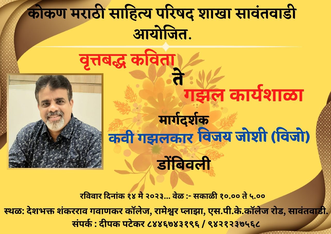 सावंतवाडी प्रतिनिधी: कोकण मराठी साहित्य परिषद सावंतवाडी शाखेच्या वतीने “वृत्तबद्ध कविता ते गझल” कार्यशाळेचे आयोजन देशभक्त शंकरराव गवाणकर कॉलेज, रामेश्वर प्लाझा, सावंतवाडी येथे रविवार दि.१४ मे सकाळी दहा वाजता करण्यात आले आहे. त्याकरिता नांव नोंदणी करावी असे आवाहन कोकण मराठी साहित्य परिषद शाखा सावंतवाडी तर्फे करण्यात आले आहे.या कार्यशाळेचे मार्गदर्शक काव्यगुरू-कवी-गझलकार विजय जोशी (विजो) (डोंबिवली, मुंबई ) आहेत. एकदिवसीय प्रत्यक्ष कार्यशाळा रविवार दि. १४ मे रोजी सकाळी १०.०० ते सायंकाळी ५.०० या वेळेत सावंतवाडी येथे संपन्न होईल. त्यानंतर दोन महिने व्हॉट्सॲप समूहात श्री. विजय जोशी सर ऑनलाईन मार्गदर्शन वर्ग घेतील. इच्छुकांनी आपली नाव नोंदणी लवकरात लवकर करावी, म्हणजे नियोजन करणे सोयीचे होईल.या “कार्यशाळेत मात्रा म्हणजे काय..? त्या कशा मोजतात..? आणि त्याचा सराव घेण्यात येईल.वृत्त म्हणजे काय..? मात्रावृत्त, अक्षरगणवृत्त, अक्षरछंद यांची माहिती आणि सराव. गझलतंत्र आणि सराव. प्रश्नोत्तरे आणि खुली चर्चा असे नियोजन आहे. सदर कार्यशाळेतील उपस्थितांचा वेगळा व्हाट्सअप समुह बनवून तिथे जवळपास पुढील दोन महिने विविध वृत्तातील कविता, गझल रचना यांचा सराव आणि यासंबंधीचा इतर अभ्यास ऑनलाईन घेतला जाईल.