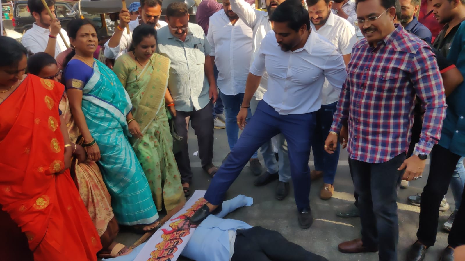 शहर प्रमुख महेश गायकवाड यांच्या नेतृत्वाखाली जोडे मारो आंदोलन_